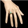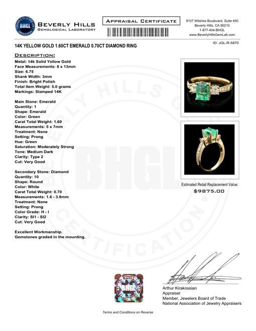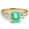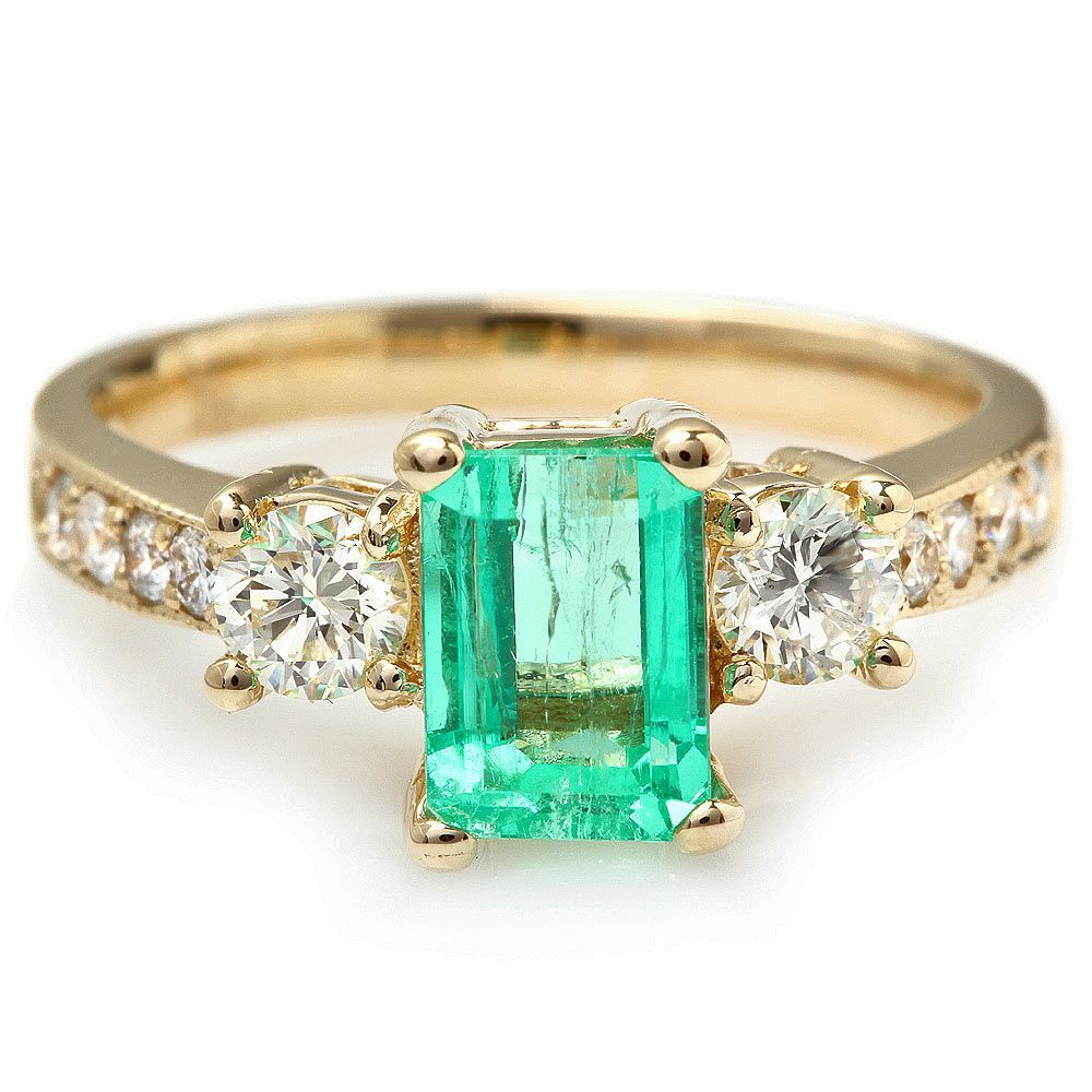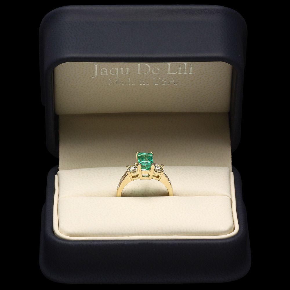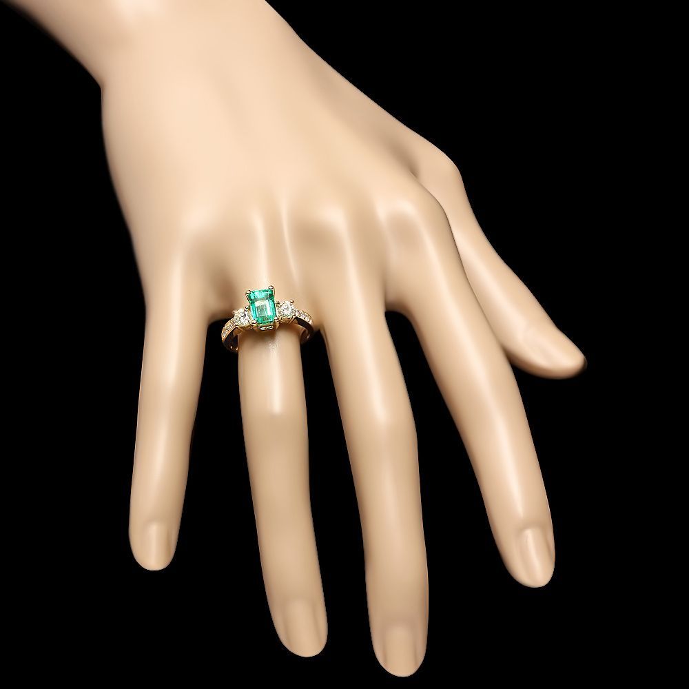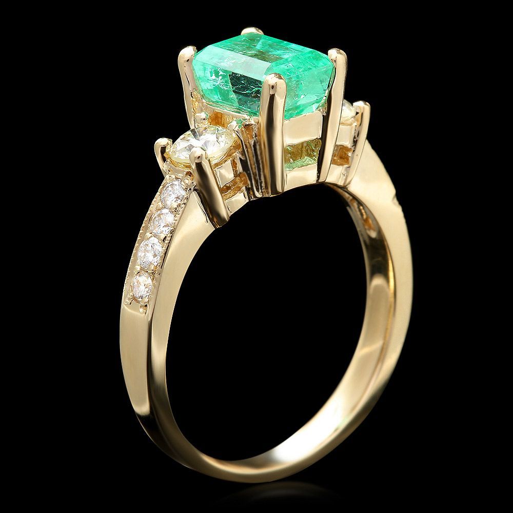 This lovely ladies ring is crafted in solid 14k Yellow Gold and features a 1.60 carat 100% Natural Emerald mined from Colombia + accented with 10 sparkling eye-clean natural Diamonds, totaling 0.70 carats. Excellent craftsmanship. Made in USA.