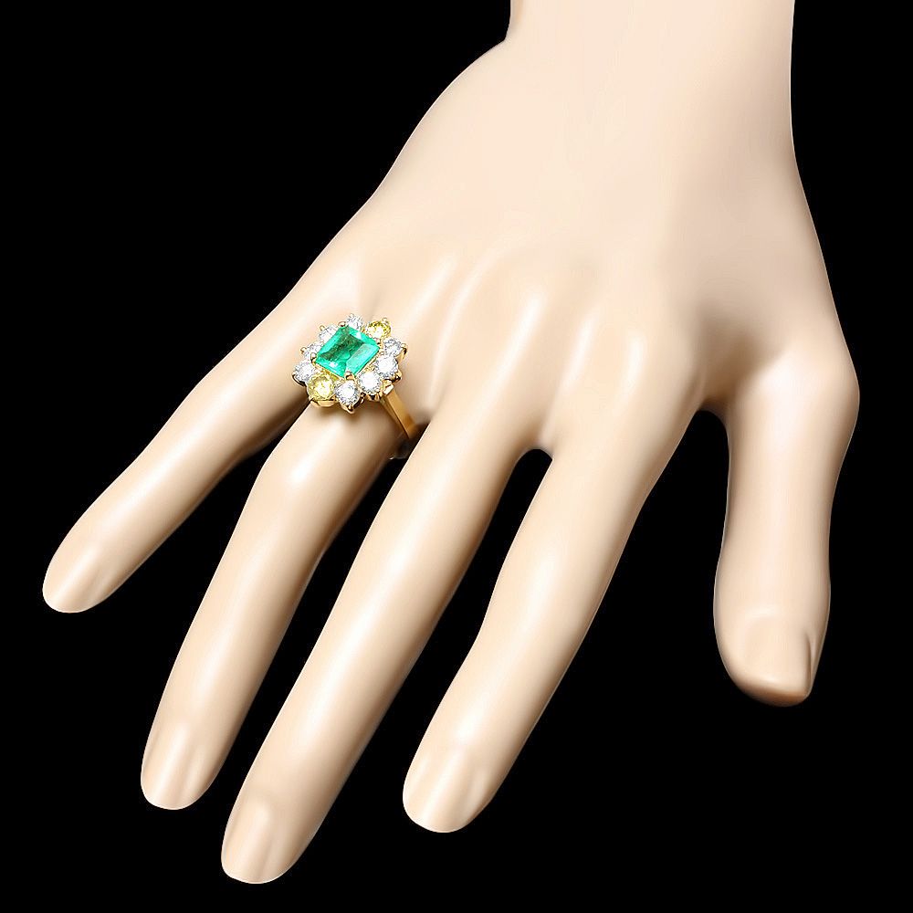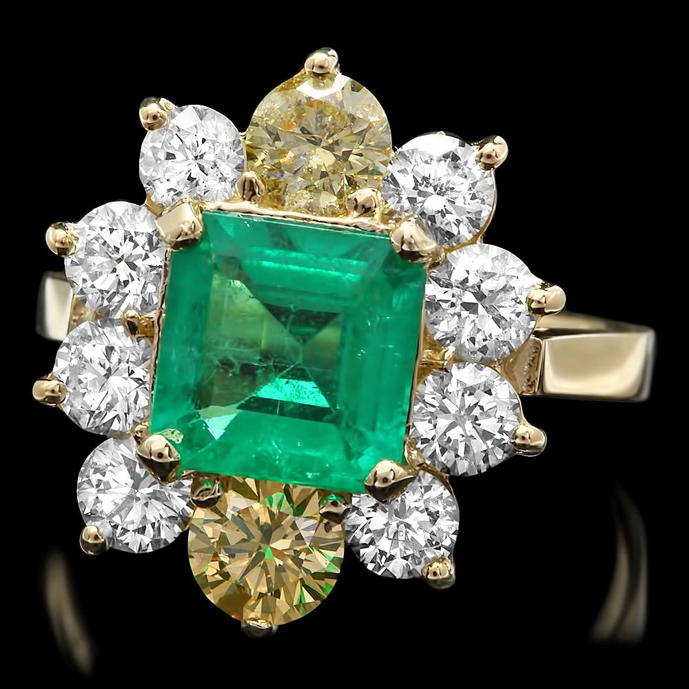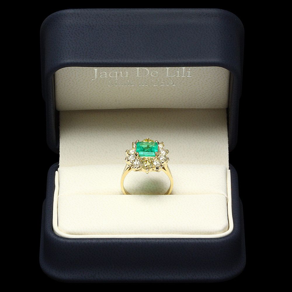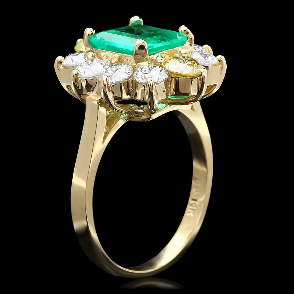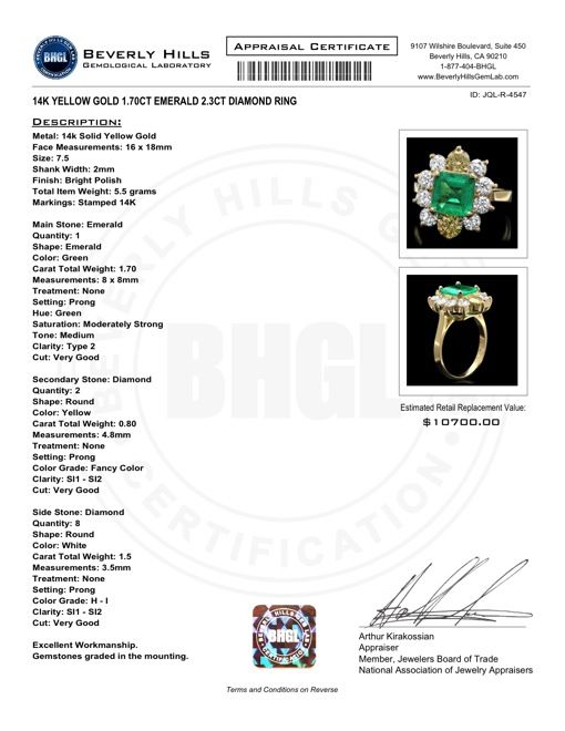 Retail: $10700.00 ****** Metal: 14k Solid Yellow Gold / Size: 7.5 / Total Item Weight: 5.5 grams / Country Made: USA / / Main Stone: Emerald / Color: Green / Carat Total Weight: 1.70 / Treatment: None / Clarity: Type 2 / Cut: Very Good / / Secondary Stone: Diamond / Carat Total Weight: 0.80 / Treatment: None / Color Grade: Fancy Color / Clarity: SI1 - SI2 / Cut: Very Good / / Side Stone: Diamond / Color: White / Carat Total Weight: 1.5 / Treatment: None / Color Grade: H - I / Clarity: SI1 - SI2 / Cut: Very Good / ****** Ref: JQL-R-4547