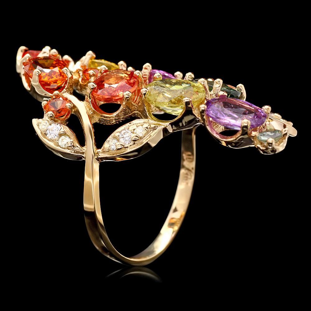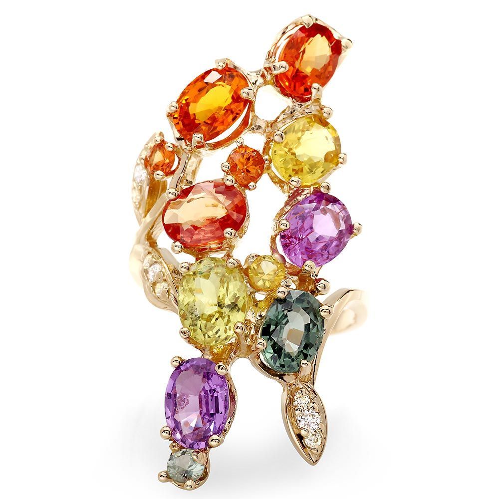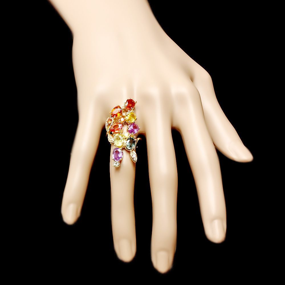 This elegant ladies ring is crafted in solid 14k Yellow Gold and features 8 (8.00 ctw) Natural Sapphires mined from Ceylon, Sri Lanka + accented with 9 sparkling eye-clean natural Diamonds, totaling 0.20 carats and 4 natural Sapphires, totaling 2.00 carats. Excellent craftsmanship. Made in USA.