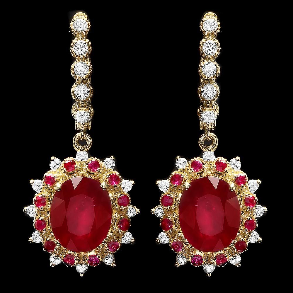 Retail: $8700.00 ****** Metal: 14k Solid Yellow Gold / Total Item Weight: 9.5 grams / Country Made: USA / / Main Stone: Ruby / Color: Red / Carat Total Weight: 11.50 / Treatment: Filling / Clarity: Type 2 / Cut: Very Good / / Secondary Stone: Diamond / Carat Total Weight: 1.20 / Treatment: None / Color Grade: H - I / Clarity: SI1 - SI2 / Cut: Very Good / / Side Stone: Ruby / Color: Red / Carat Total Weight: 0.50 / Treatment: None / Clarity: Type 2 / Cut: Very Good / ****** Ref: JQL-ER-4279