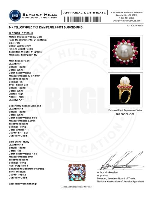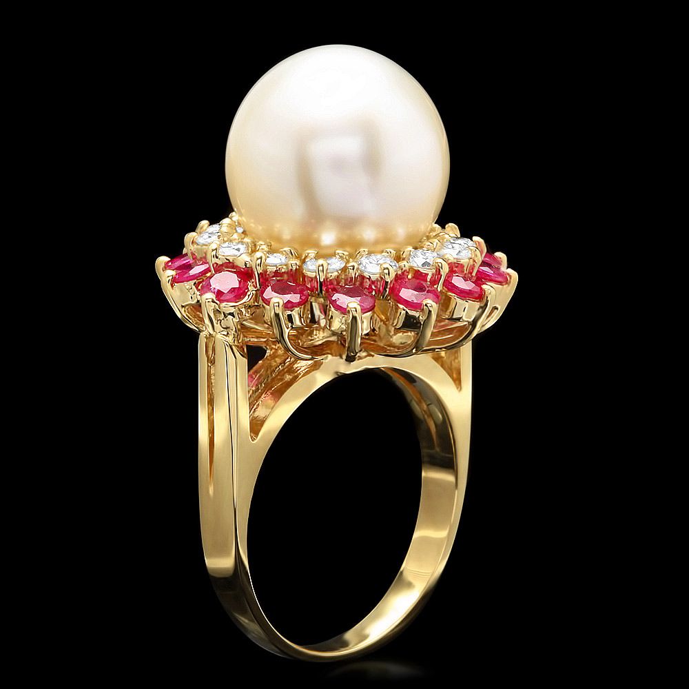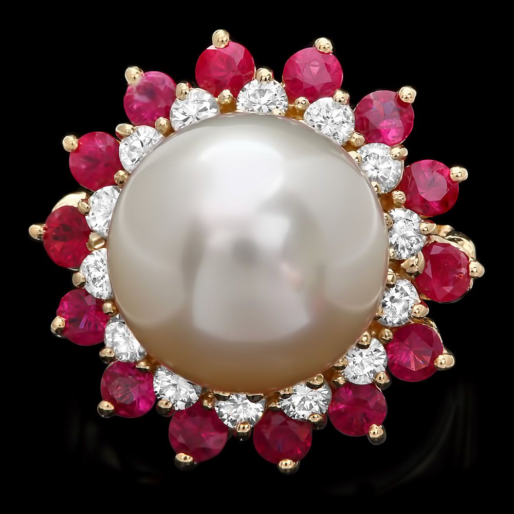 Retail: $8000.00 ****** Metal: 14k Solid Yellow Gold / Size: 7.25 / Total Item Weight: 11 grams / Country Made: USA / / Main Stone: Pearl / Color: White / Treatment: None / Type: South Sea / Color: White / Quality: AA+ / / Secondary Stone: Diamond / Carat Total Weight: 0.80 / Treatment: None / Color Grade: H - I / Clarity: SI1 - SI2 / Cut: Very Good / / Side Stone: Ruby / Color: Red / Carat Total Weight: 1.50 / Treatment: None / Clarity: Type 2 / Cut: Very Good / ****** Ref: JQL-R-4502