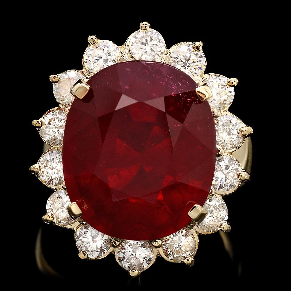 Retail: $16750.00 ****** Metal: 14k Solid Yellow Gold / Size: 6 / Total Item Weight: 11.5 grams / Country Made: USA / / Main Stone: Ruby / Color: Red / Carat Total Weight: 15.00 / Treatment: Filling / Clarity: Type 2 / Cut: Very Good / / Secondary Stone: Diamond / Carat Total Weight: 1.70 / Treatment: None / Color Grade: H - I / Clarity: SI1 - SI2 / Cut: Very Good / ****** Ref: JQL-R-5943