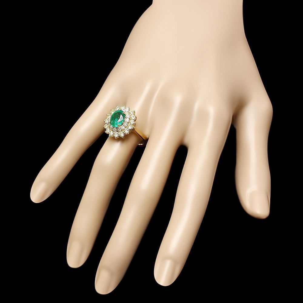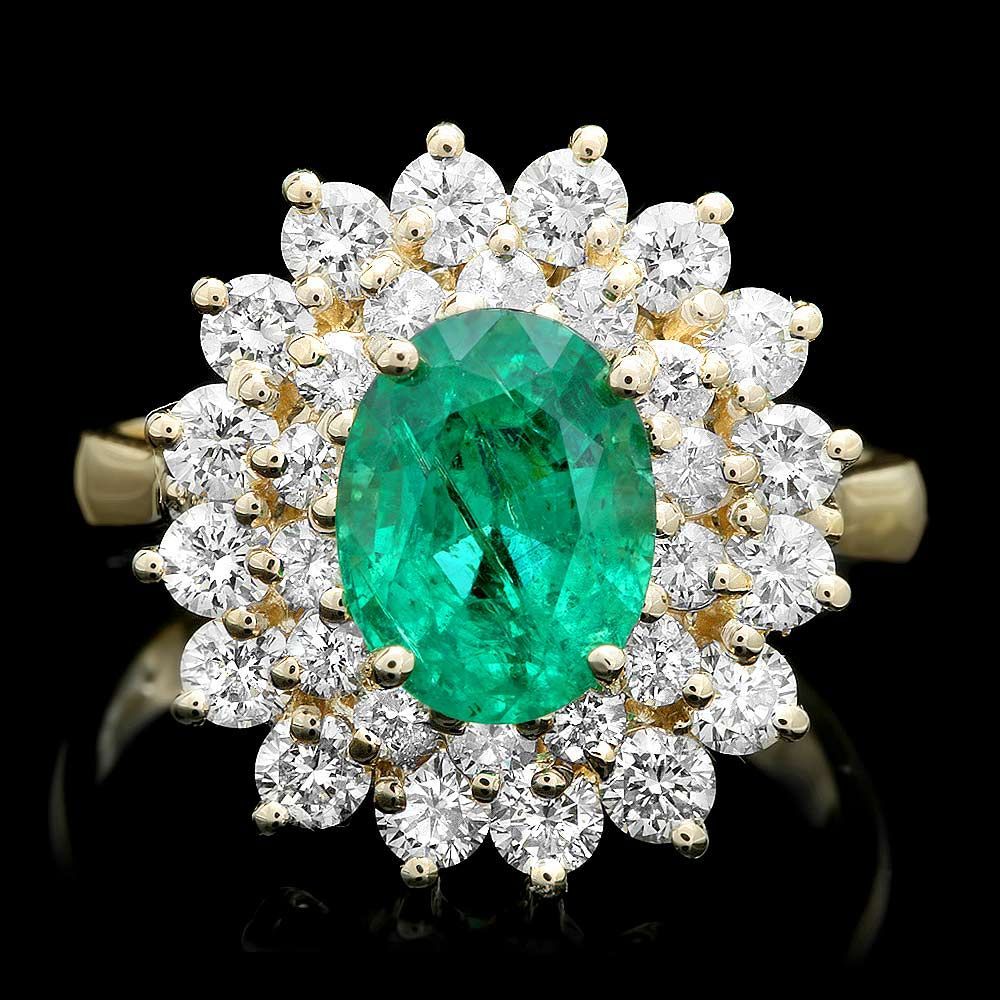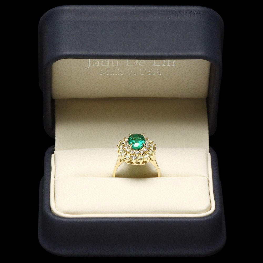 This luxurious ladies ring is crafted in solid 14k Yellow Gold and features a 2.00 carat 100% Natural Emerald mined from Colombia + accented with 30 sparkling eye-clean natural diamonds, totaling 1.50 carats. Excellent craftsmanship. Made in USA.