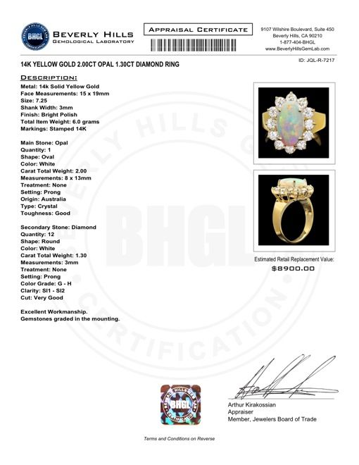 Retail: $8900.00 ****** Metal: 14k Solid Yellow Gold / Size: 7.25 / Total Item Weight: 6.0 grams / Country Made: USA / / Main Stone: Opal / Color: White / Carat Total Weight: 2.00 / Treatment: None / Origin: Australia / Type: Crystal / Toughness: Good / / Secondary Stone: Diamond / Carat Total Weight: 1.30 / Treatment: None / Color Grade: G - H / Clarity: SI1 - SI2 / Cut: Very Good / ****** Ref: JQL-R-7217