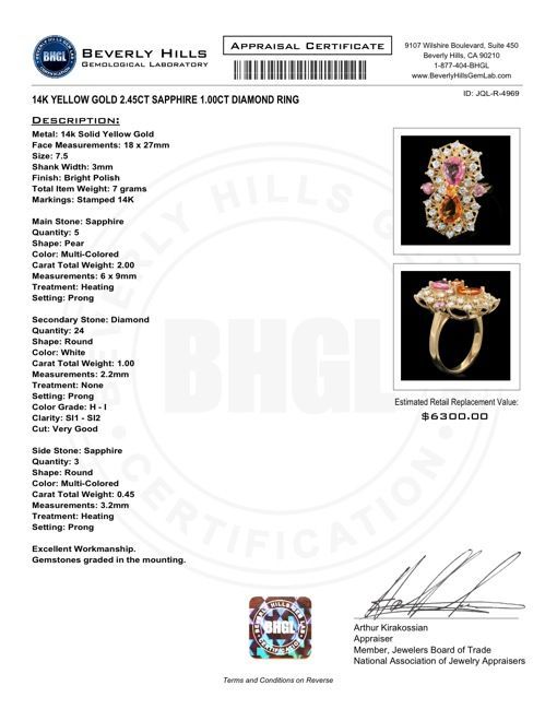Regarding Appraised Jewelry and Loose Stones - WESTBURY AUCTION GALLERIES sends them out to a third party for Retail Replacement Value Appraisals, which are the most common. These types of evaluations are written for insurance needs. This would be the cost to replace the jewelry with an item of equal quality and kind, considered to be the current market price or the replacement value. This type of appraisal is done to protect you in the event of damage or loss of a valuable item. Our appraisals are conducted by independent 3rd Party appraisal firms that utilizes Certified GIA Gemologist. Appraisals should be used for verification of gemstone and/or metal weight, size, and grade only, not actual value. Appraisal value should be considered for insurance purposes only, not actual value, as price varies greatly from retail locations thru out the world. Items should not be purchased with the expectation to resell for appraisal price, or for profit.