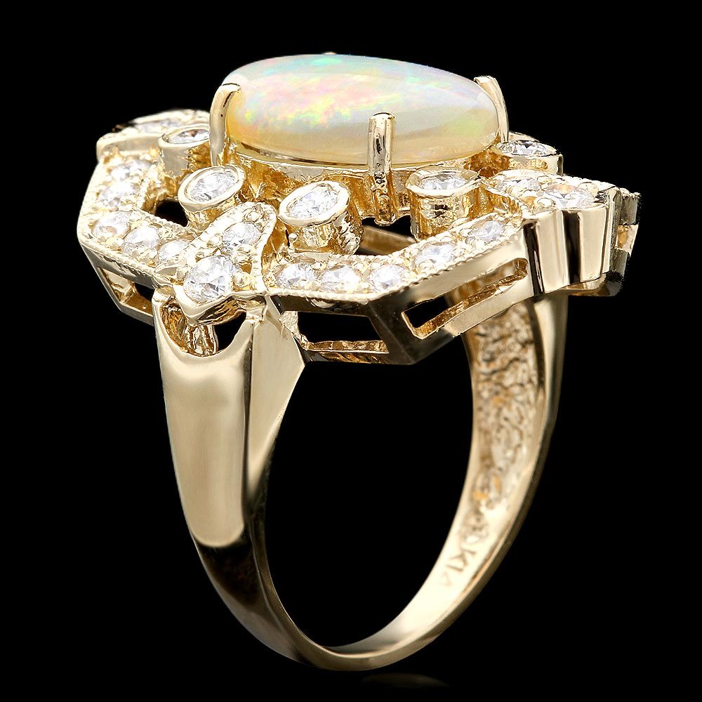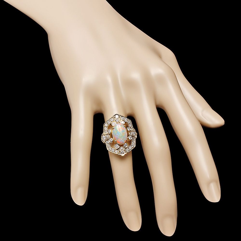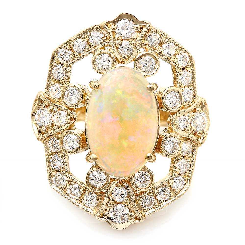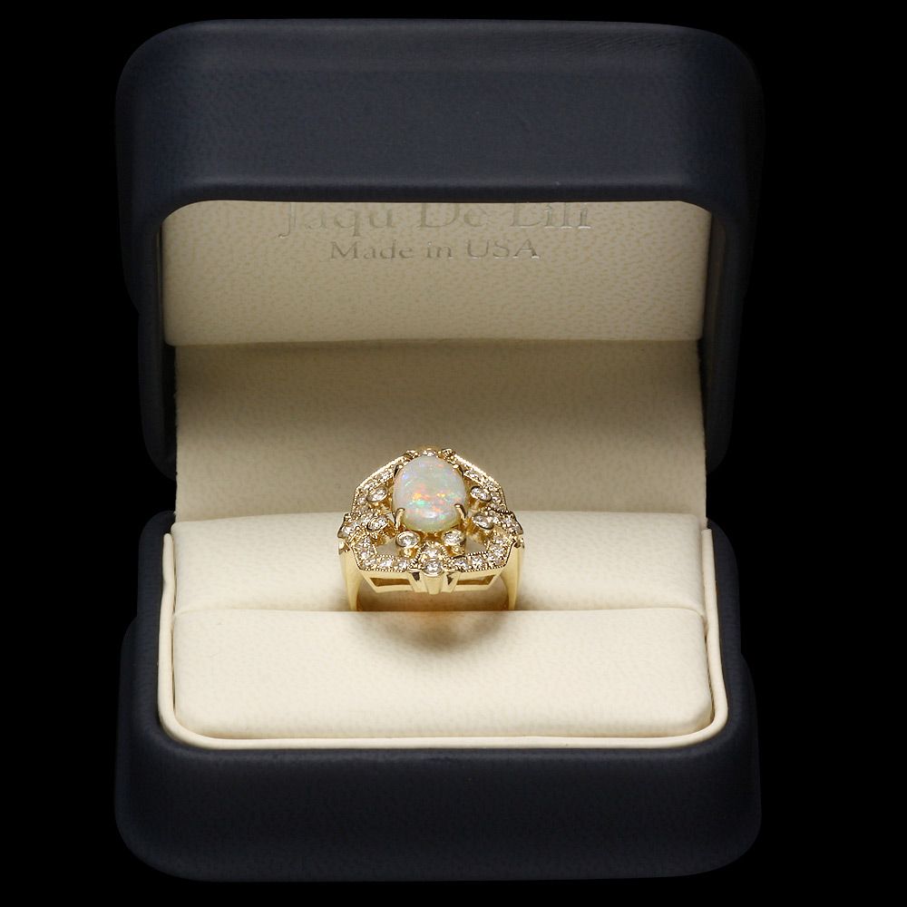 Retail: $13250.00 ****** Metal: 14k Solid Yellow Gold / Size: 7.5 / Total Item Weight: 8.0 grams / Country Made: USA / / Main Stone: Opal / Color: Multi-Colored / Carat Total Weight: 2.50 / Treatment: None / Origin: Australia / Type: Crystal / Toughness: Good / / Secondary Stone: Diamond / Carat Total Weight: 1.25 / Treatment: None / Color Grade: H - I / Clarity: SI1 - SI2 / Cut: Very Good / ****** Ref: JQL-R-5855