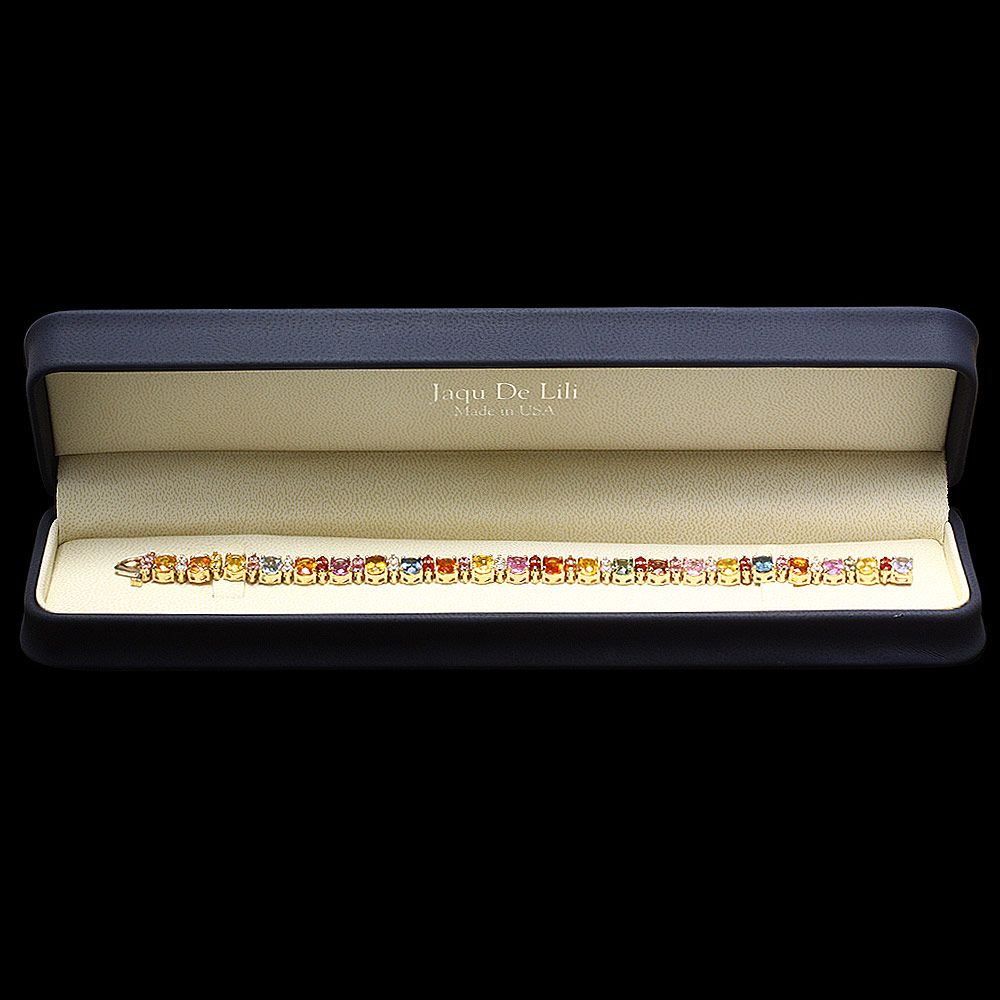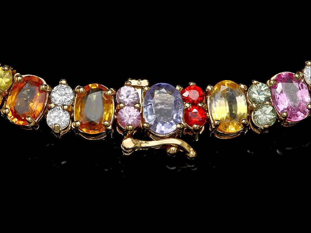 Retail: $14800.00 ****** Metal: 14k Solid Yellow Gold / Size: 7.5 / Total Item Weight: 24.5 grams / Country Made: USA / / Main Stone: Sapphire / Color: Multi-Colored / Carat Total Weight: 20.00 / Treatment: Heating / / Secondary Stone: Diamond / Carat Total Weight: 1.50 / Treatment: None / Color Grade: H - I / Clarity: SI1 - SI2 / Cut: Very Good / / Side Stone: Sapphire / Color: Multi-Colored / Carat Total Weight: 3.00 / Treatment: Heating / ****** Ref: JQL-BR-4848