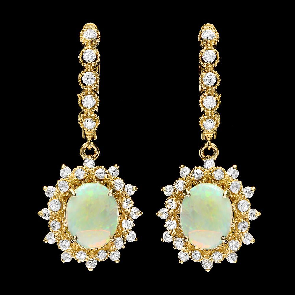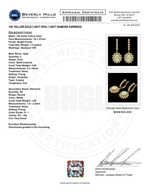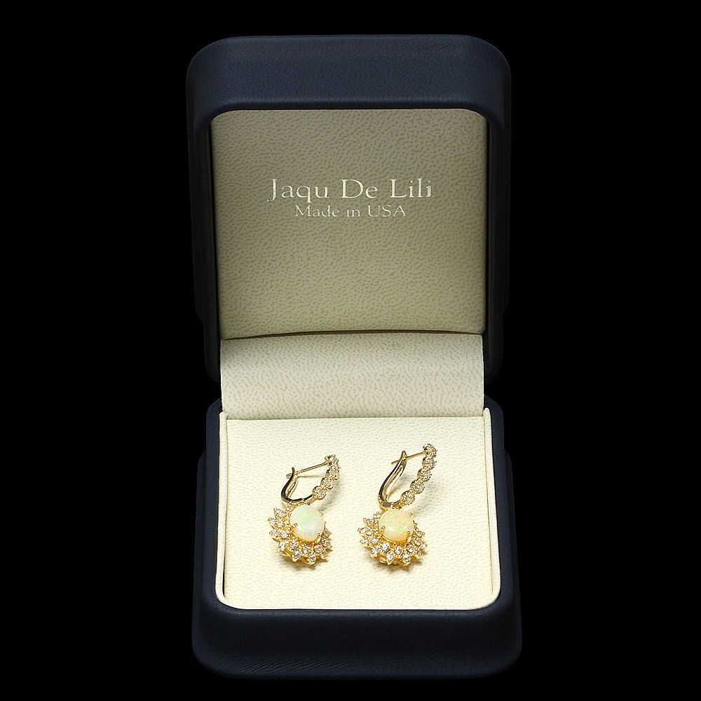 Retail: $8850.00 ****** Metal: 14k Solid Yellow Gold / Total Item Weight: 7.4 grams / Country Made: USA / / Main Stone: Opal / Color: Multi-Colored / Carat Total Weight: 3.00 / Treatment: None / Origin: Australia / Type: Crystal / Toughness: Fair / / Secondary Stone: Diamond / Carat Total Weight: 1.65 / Treatment: None / Color Grade: H - I / Clarity: SI1 - SI2 / Cut: Very Good / ****** Ref: JQL-ER-4072