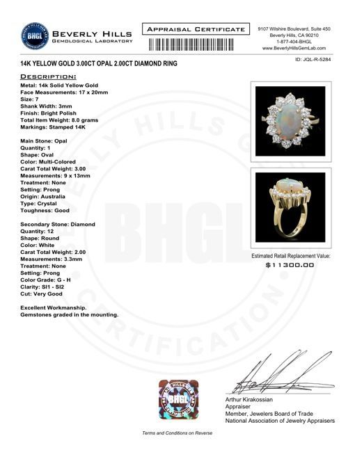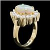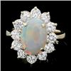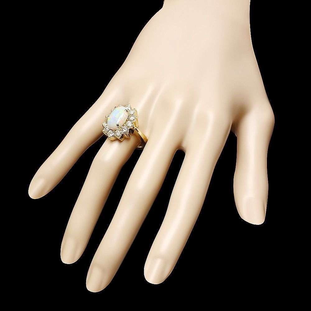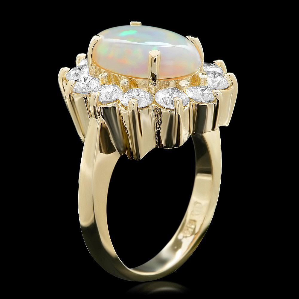 This magnificent ladies ring is crafted in solid 14k Yellow Gold and features a 3.00 carat 100% Natural Opal mined from Australia + accented with 12 sparkling eye-clean natural diamonds, totaling 2.00 carats. Excellent craftsmanship. Made in USA.