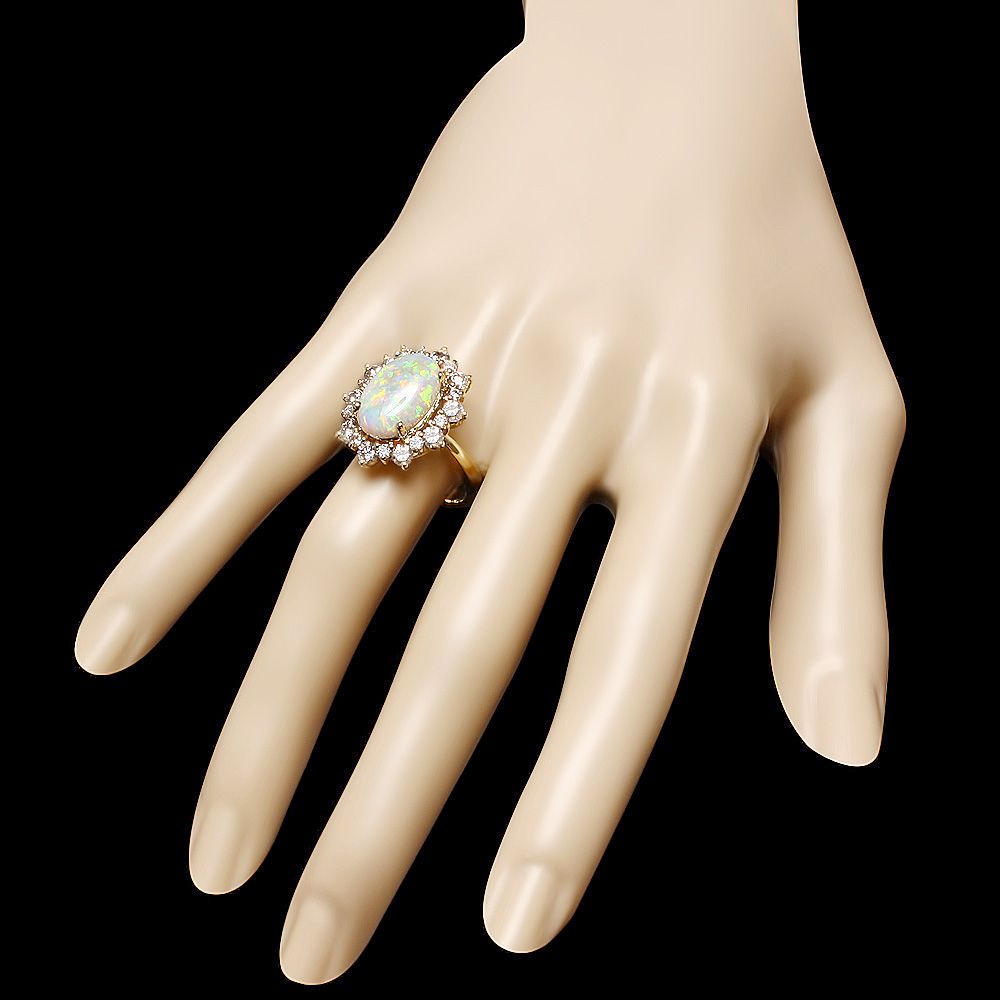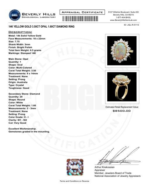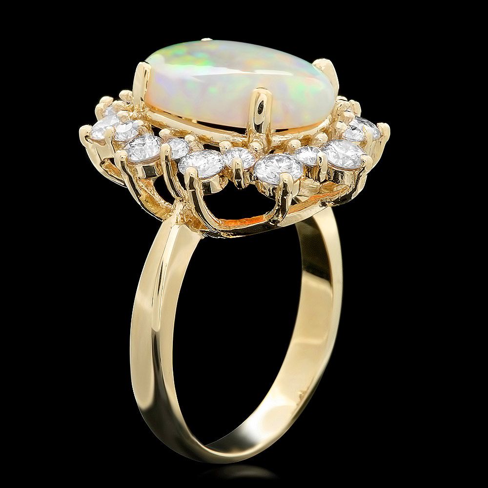 Retail: $8500.00 ****** Metal: 14k Solid Yellow Gold / Size: 7.75 / Total Item Weight: 6.5 grams / Country Made: USA / / Main Stone: Opal / Color: Multi-Colored / Carat Total Weight: 3.50 / Treatment: None / Origin: Australia / Type: Crystal / Toughness: Good / / Secondary Stone: Diamond / Carat Total Weight: 1.60 / Treatment: None / Color Grade: H - I / Clarity: SI1 - SI2 / Cut: Very Good / ****** Ref: JQL-R-5113