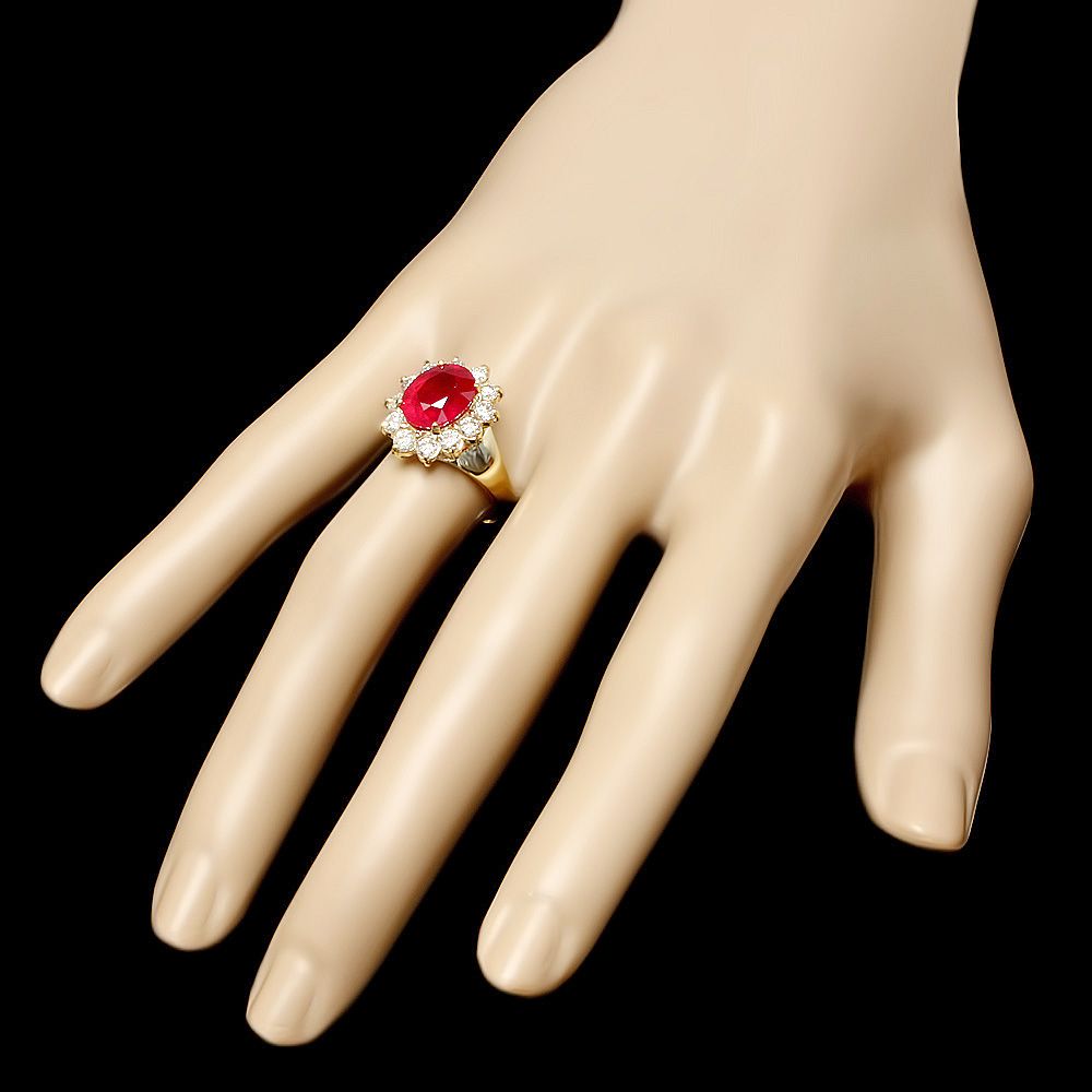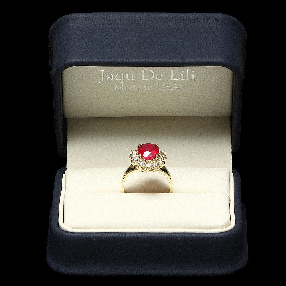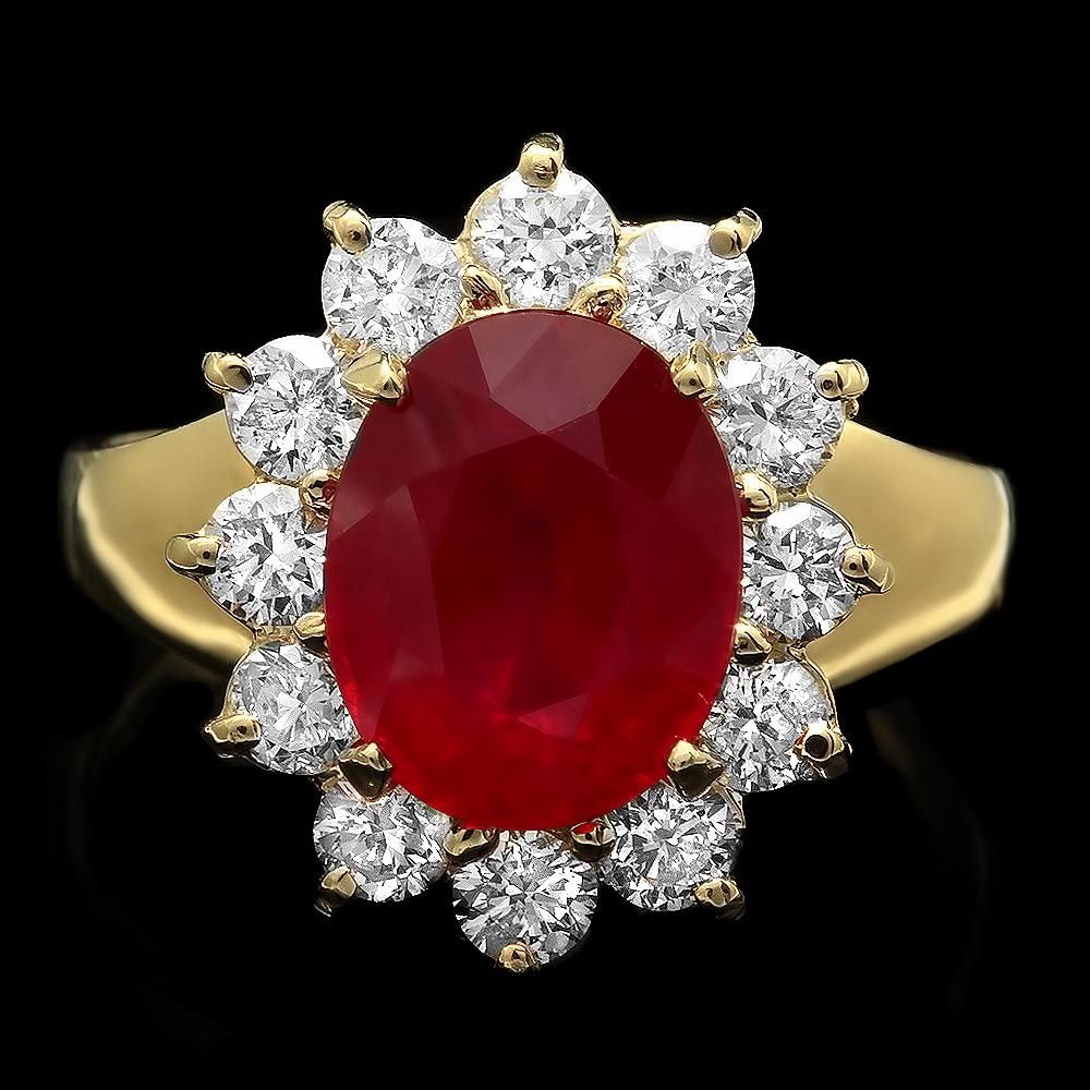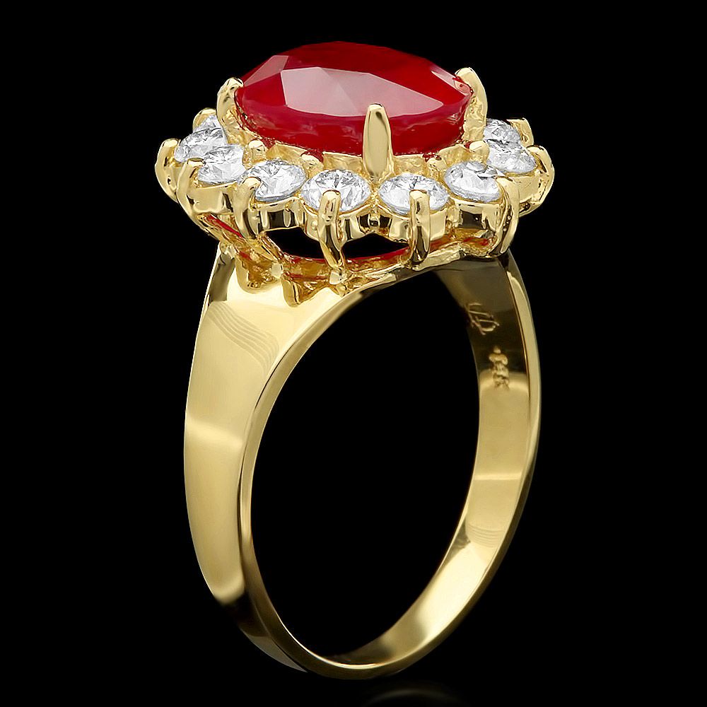 Retail: $6400.00 ****** Metal: 14k Solid Yellow Gold / Size: 7.5 / Total Item Weight: 3.83 grams / Country Made: USA / / Main Stone: Ruby / Color: Red / Carat Total Weight: 3.83 / Treatment: Filling / Clarity: Type 2 / Cut: Very Good / / Secondary Stone: Diamond / Carat Total Weight: 1.00 / Treatment: None / Color Grade: H - I / Clarity: SI1 - SI2 / Cut: Very Good / ****** Ref: JQL-R-4139