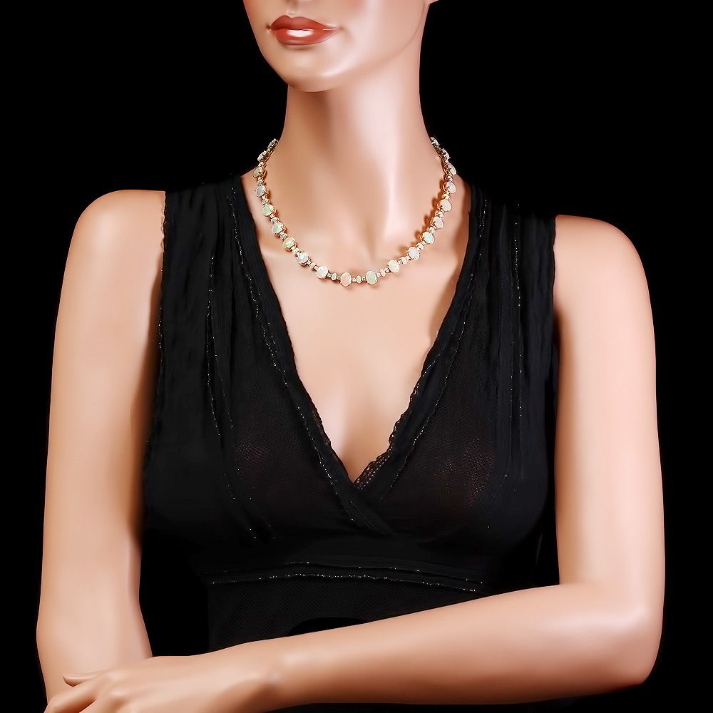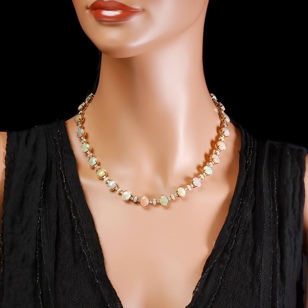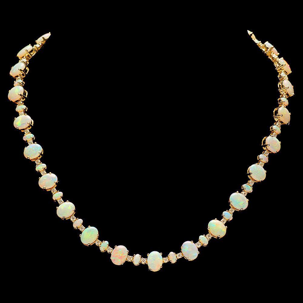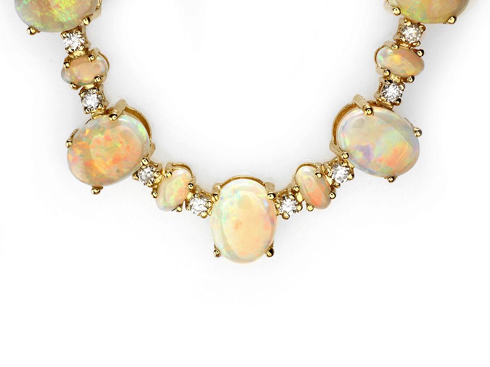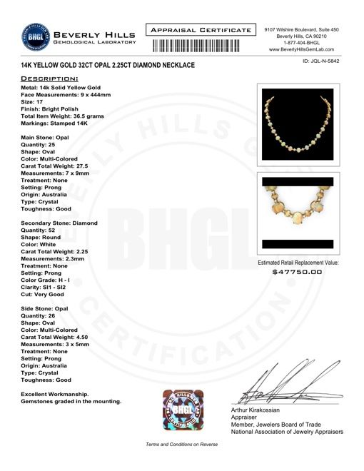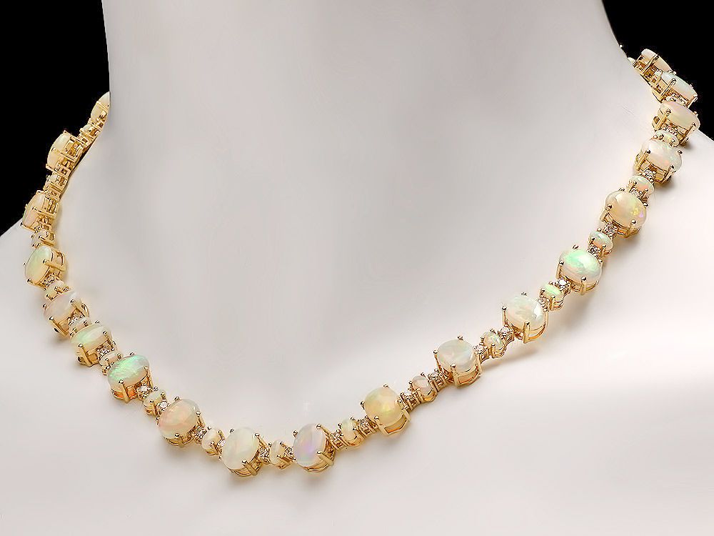 Retail: $47750.00 ****** Metal: 14k Solid Yellow Gold / Size: 17 / Total Item Weight: 36.5 grams / Country Made: USA / / Main Stone: Opal / Color: Multi-Colored / Carat Total Weight: 27.5 / Treatment: None / Origin: Australia / Type: Crystal / Toughness: Good / / Secondary Stone: Diamond / Carat Total Weight: 2.25 / Treatment: None / Color Grade: H - I / Clarity: SI1 - SI2 / Cut: Very Good / / Side Stone: Opal / Color: Multi-Colored / Carat Total Weight: 4.50 / Treatment: None / Origin: Australia / Type: Crystal / Toughness: Good / ****** Ref: JQL-N-5842