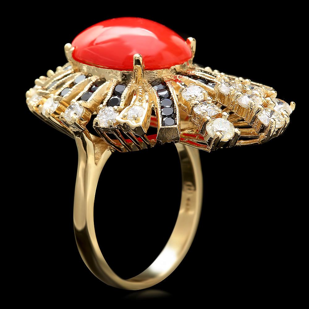 Retail: $16750.00 ****** Metal: 14k Solid Yellow Gold / Size: 7 / Total Item Weight: 9.5 grams / Country Made: USA / / Main Stone: Coral / Color: Orange / Carat Total Weight: 4.00 / Treatment: None / Clarity: Type 2 / Cut: Very Good / / Secondary Stone: Diamond / Carat Total Weight: 1.40 / Treatment: None / Color Grade: H - I / Clarity: SI1 - SI2 / Cut: Very Good / / Side Stone: Sapphire / Color: Blue / Carat Total Weight: 1.30 / Treatment: Heating / Clarity: Type 2 / Cut: Very Good / ****** Ref: JQL-R-5868