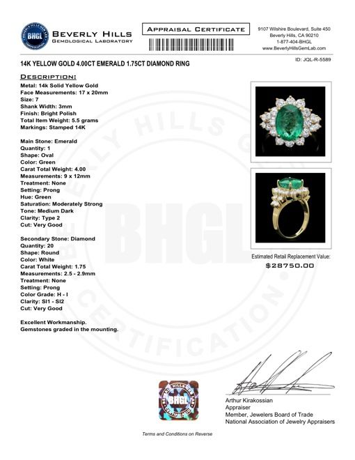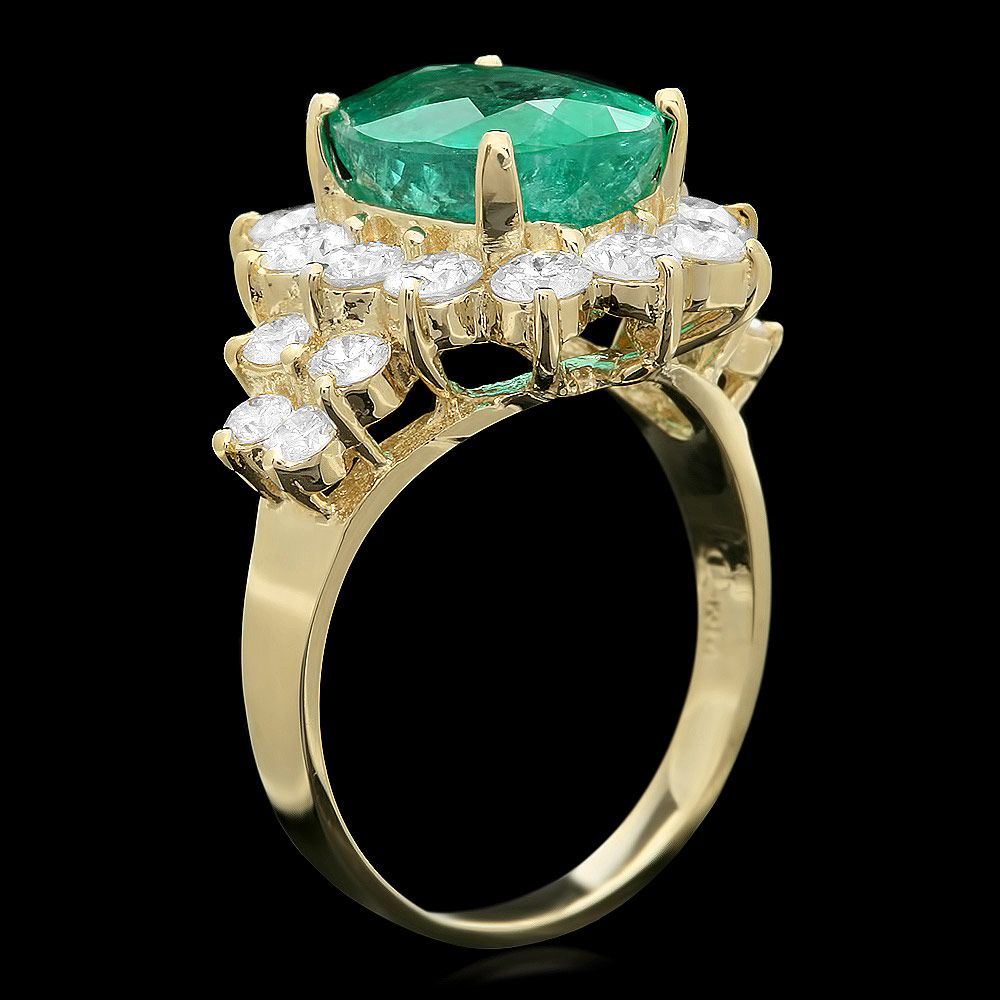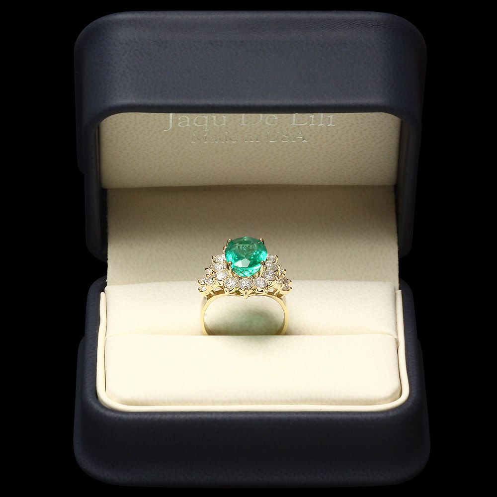Retail: $28750.00 ****** Metal: 14k Solid Yellow Gold / Size: 7 / Total Item Weight: 5.5 grams / Country Made: USA / / Main Stone: Emerald / Color: Green / Carat Total Weight: 4.00 / Treatment: None / Clarity: Type 2 / Cut: Very Good / / Secondary Stone: Diamond / Carat Total Weight: 1.75 / Treatment: None / Color Grade: H - I / Clarity: SI1 - SI2 / Cut: Very Good / ****** Ref: JQL-R-5589
