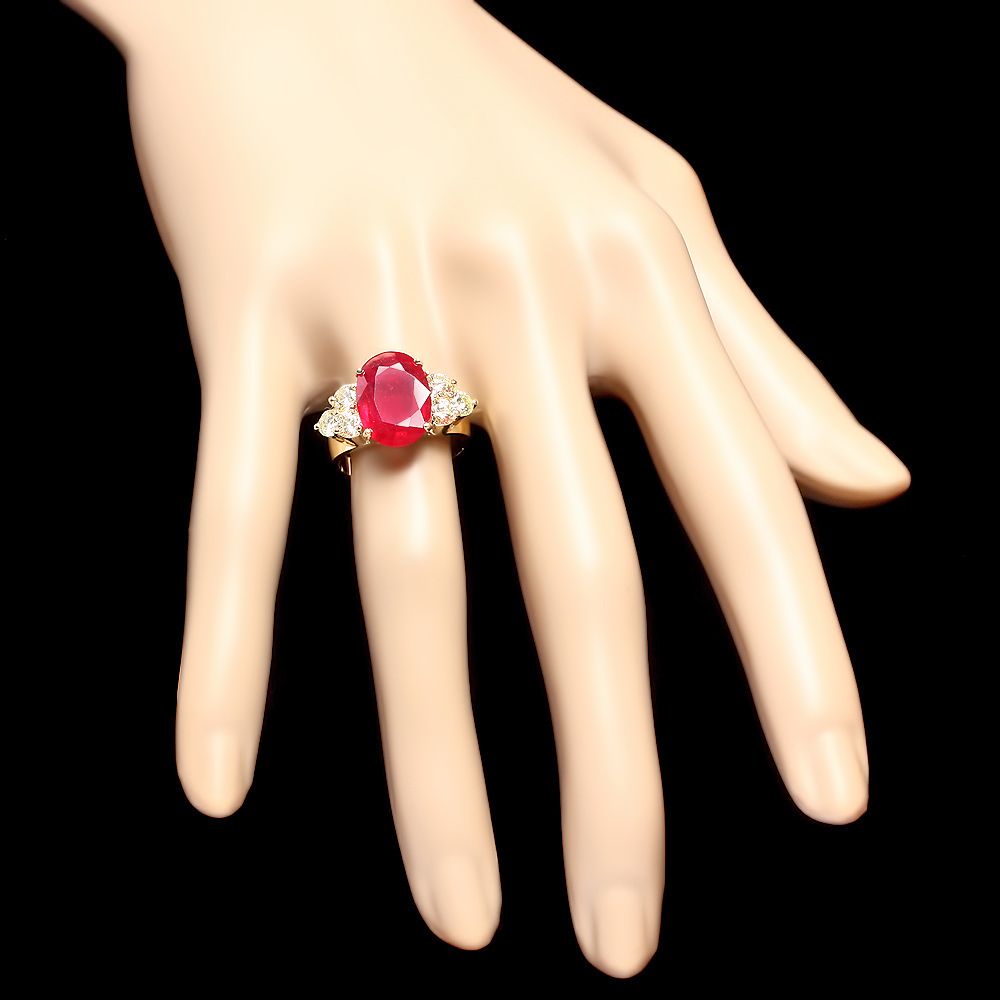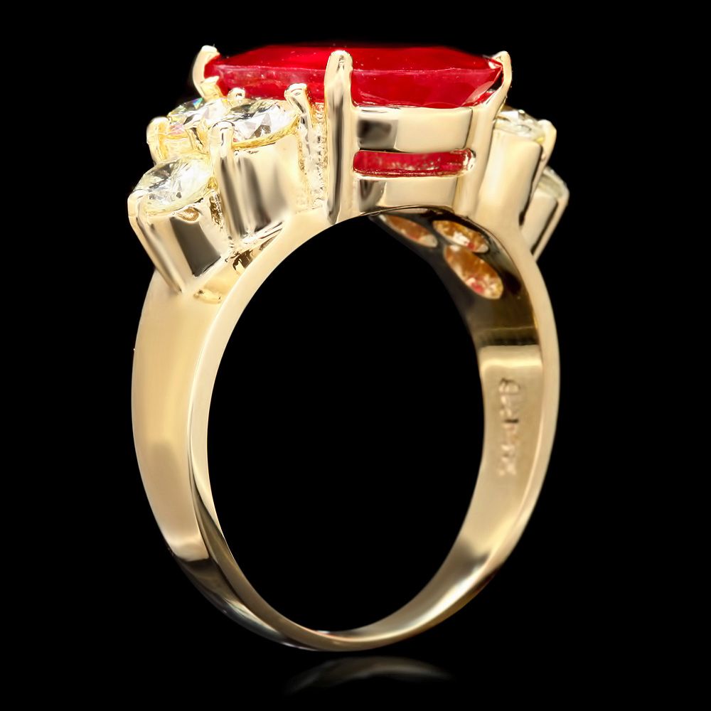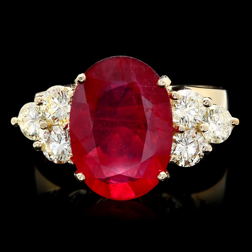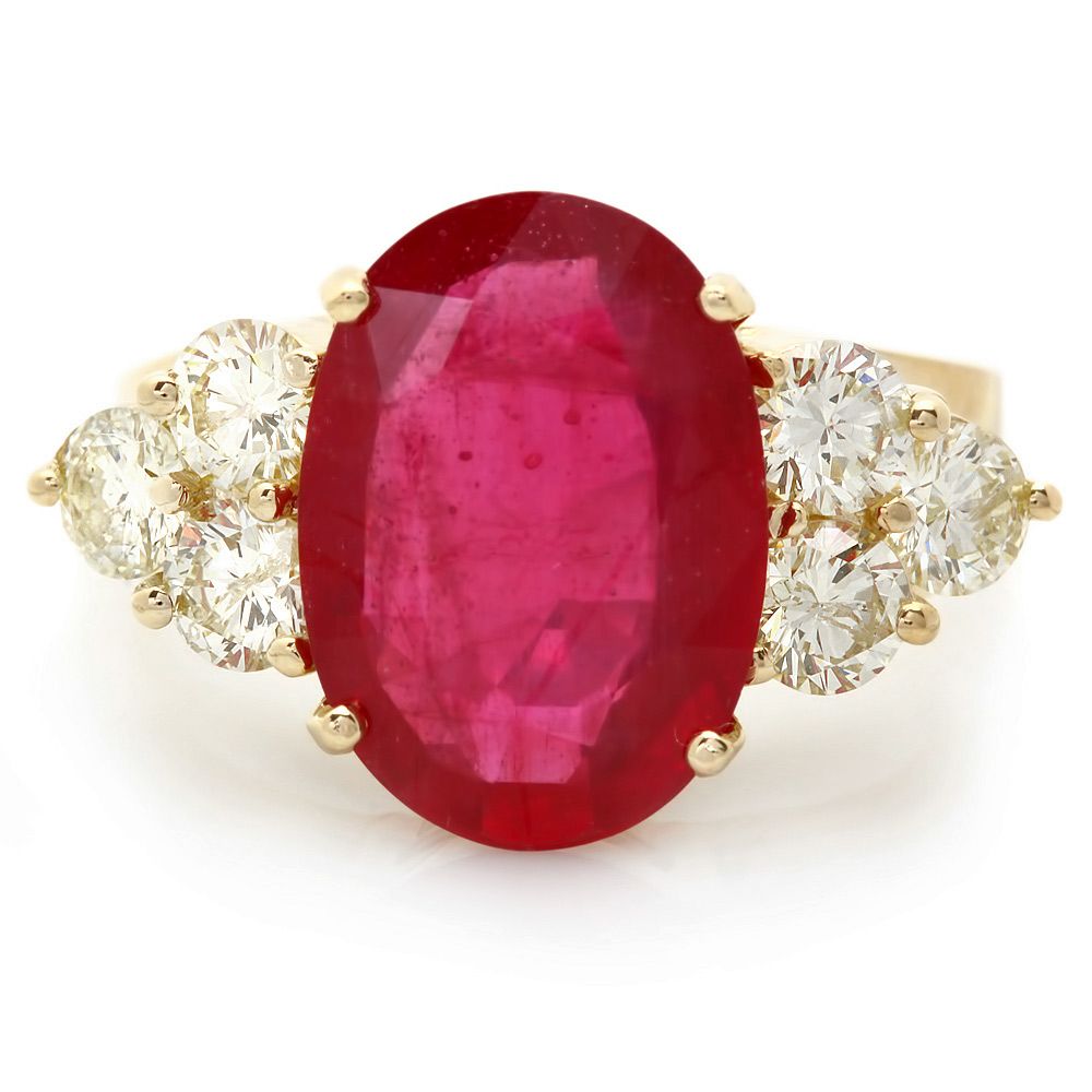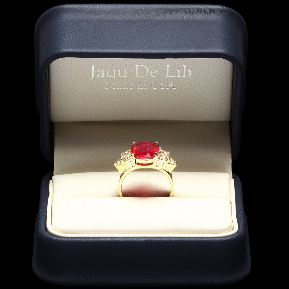 Retail: $6200.00 ****** Metal: 14k Solid Yellow Gold / Size: 7 / Total Item Weight: 7.0 grams / Country Made: USA / / Main Stone: Ruby / Color: Red / Carat Total Weight: 5.00 / Treatment: Filling / Clarity: Type 2 / Cut: Very Good / / Secondary Stone: Diamond / Carat Total Weight: 1.20 / Treatment: Routinely Enhanced / Color Grade: H - I / Clarity: SI1 - SI2 / Cut: Very Good / ****** Ref: JQL-R-7738