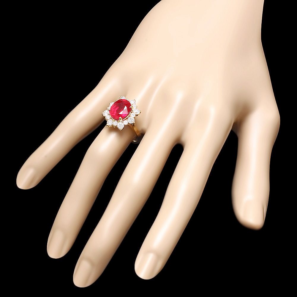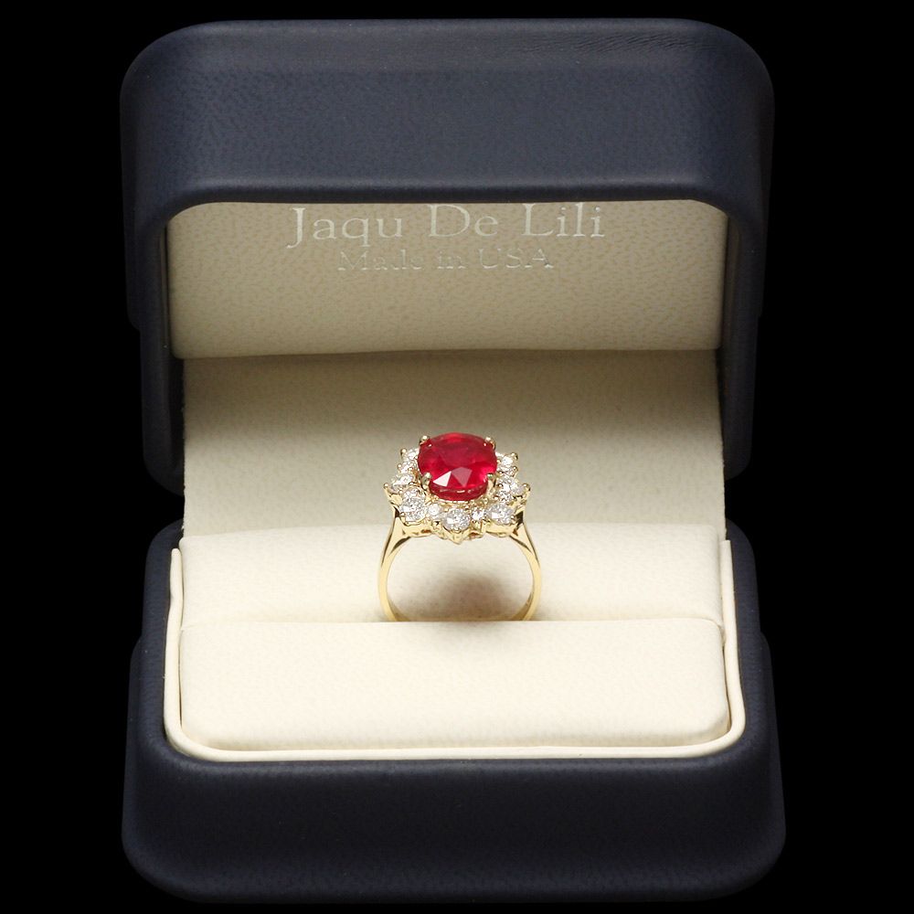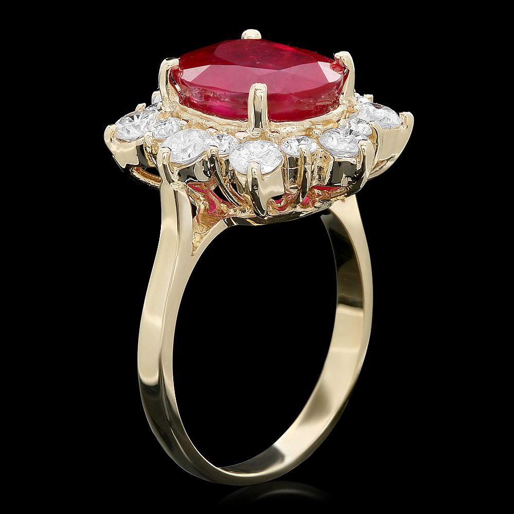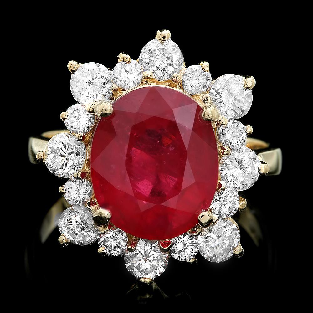 Retail: $8700.00 ****** Metal: 14k Solid Yellow Gold / Size: 6.5 / Total Item Weight: 6.0 grams / Country Made: USA / / Main Stone: Ruby / Color: Red / Carat Total Weight: 5.50 / Treatment: Filling / Clarity: Type 2 / Cut: Very Good / / Secondary Stone: Diamond / Carat Total Weight: 1.40 / Treatment: None / Color Grade: H - I / Clarity: SI1 - SI2 / Cut: Very Good / ****** Ref: JQL-R-5381
