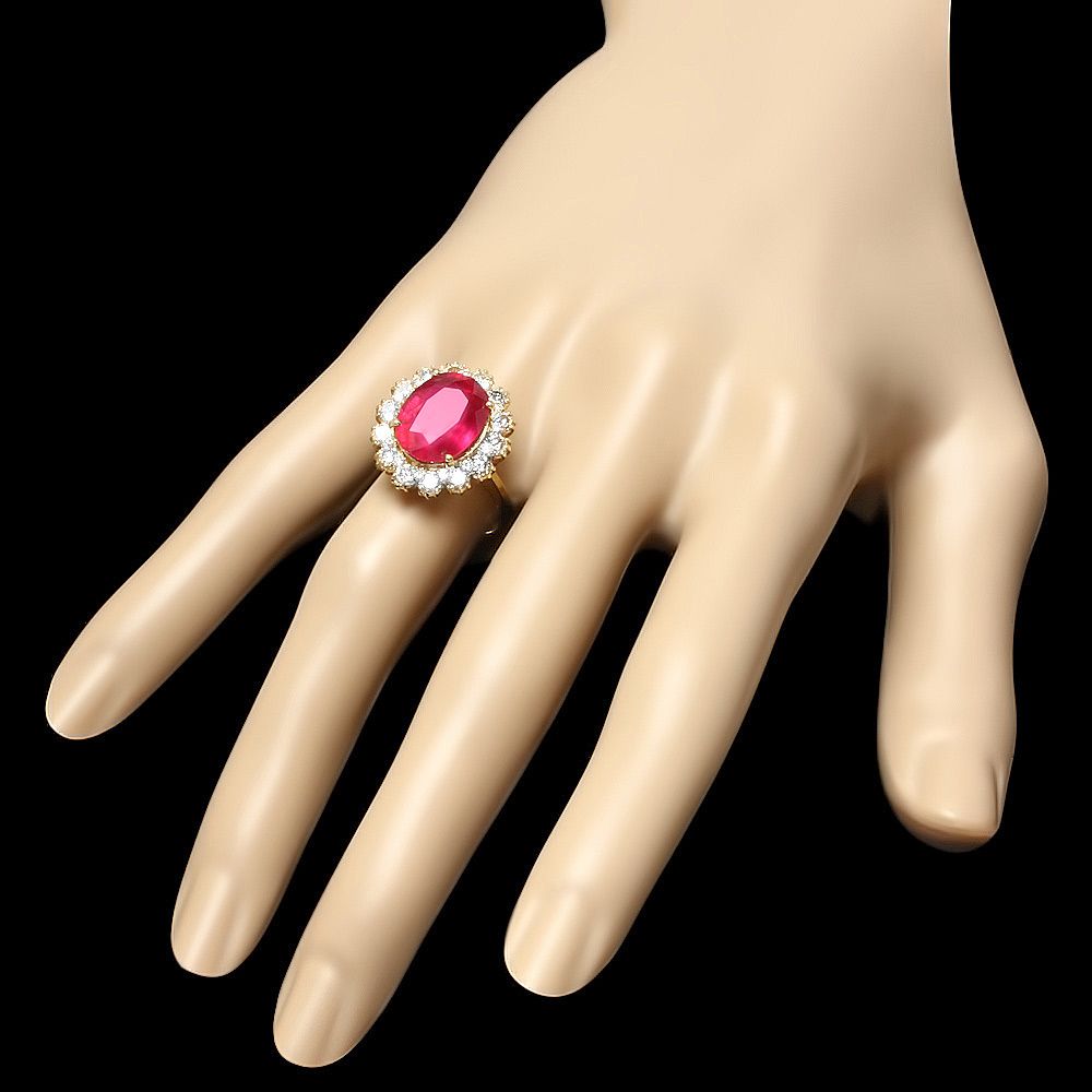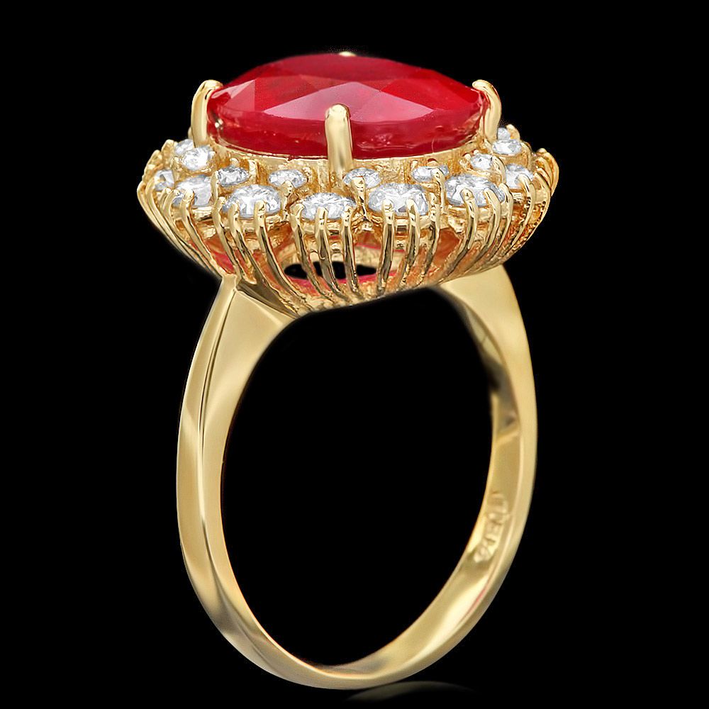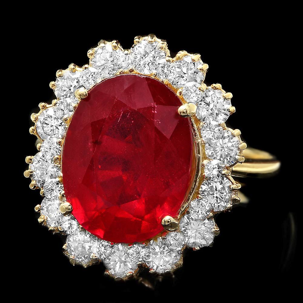 Retail: $11200.00 ****** Metal: 14k Solid Yellow Gold / Size: 7.5 / Total Item Weight: 6.5 grams / Country Made: USA / / Main Stone: Ruby / Color: Red / Carat Total Weight: 7.30 / Treatment: Filling / Clarity: Type 2 / Cut: Very Good / / Secondary Stone: Diamond / Carat Total Weight: 1.60 / Treatment: None / Color Grade: H - I / Clarity: SI1 - SI2 / Cut: Very Good / ****** Ref: JQL-R-4341