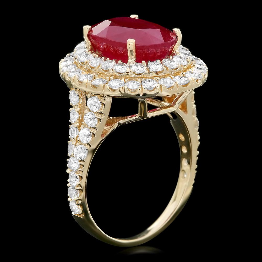 Retail: $9100.00 ****** Metal: 14k Solid Yellow Gold / Size: 7.25 / Total Item Weight: 8.0 grams / Country Made: USA / / Main Stone: Ruby / Color: Red / Carat Total Weight: 7.50 / Treatment: Filling / Clarity: Type 2 / Cut: Very Good / / Secondary Stone: Diamond / Carat Total Weight: 2.40 / Treatment: None / Color Grade: H - I / Clarity: SI1 - SI2 / Cut: Very Good / ****** Ref: JQL-R-5246