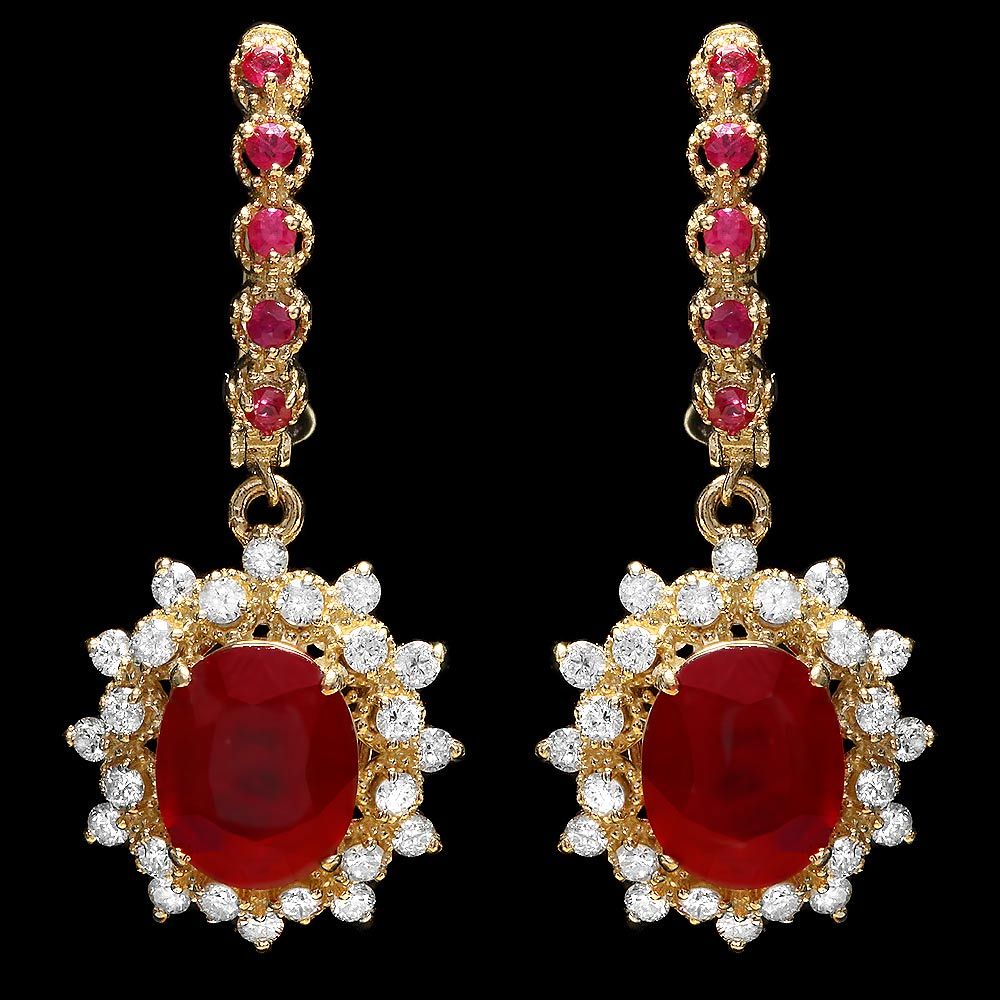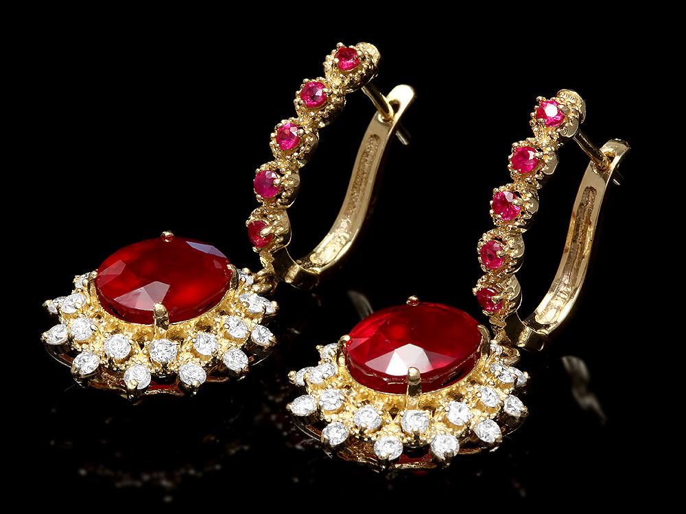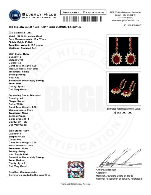 Retail: $8200.00 ****** Metal: 14k Solid Yellow Gold / Total Item Weight: 8.5 grams / Country Made: USA / / Main Stone: Ruby / Color: Red / Carat Total Weight: 7.00 / Treatment: Filling / Clarity: Type 2 / Cut: Very Good / / Secondary Stone: Diamond / Carat Total Weight: 1.30 / Treatment: None / Color Grade: H - I / Clarity: SI1 - SI2 / Cut: Very Good / / Side Stone: Ruby / Color: Red / Carat Total Weight: 0.50 / Treatment: None / Clarity: Type 2 / Cut: Very Good / ****** Ref: JQL-ER-4687