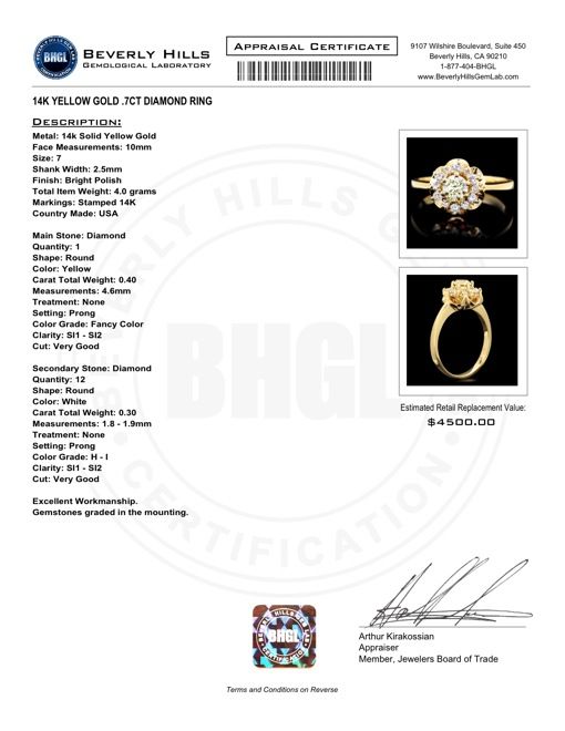 Retail: $4500.00 ****** Metal: 14k Solid Yellow Gold / Size: 7 / Total Item Weight: 4.0 grams / Country Made: USA / / Main Stone: Diamond / Color: Yellow / Carat Total Weight: 0.40 / Treatment: None / Color Grade: Fancy Color / Clarity: SI1 - SI2 / Cut: Very Good / / Secondary Stone: Diamond / Carat Total Weight: 0.30 / Treatment: None / Color Grade: H - I / Clarity: SI1 - SI2 / Cut: Very Good / ****** Ref: JQL-R-7926