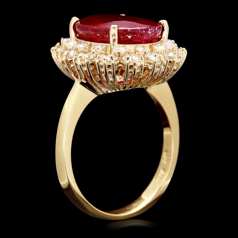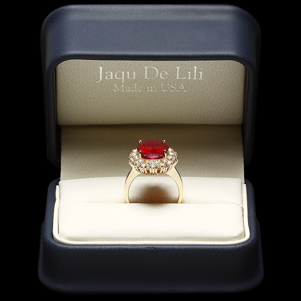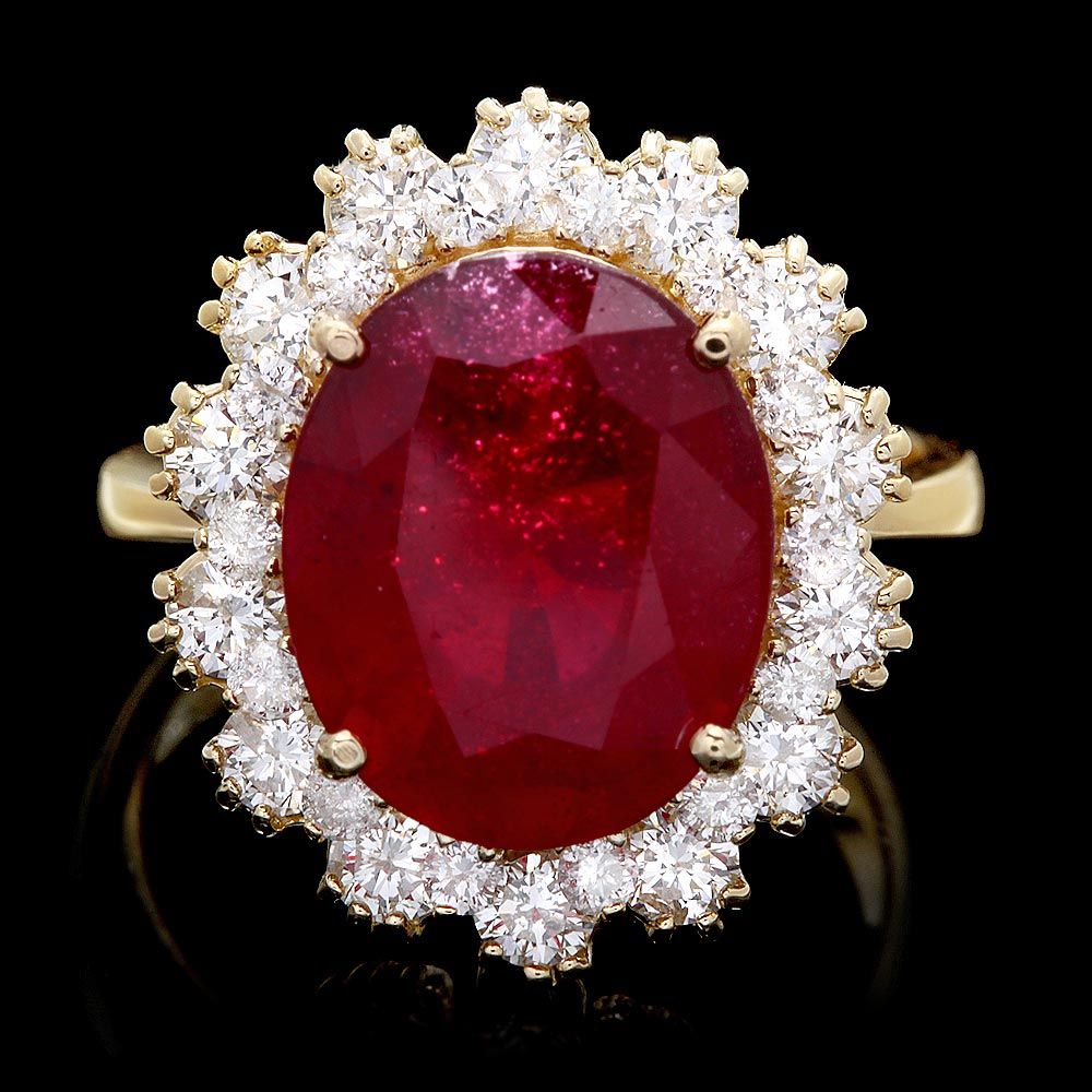 Retail: $9800.00 ****** Metal: 14k Solid Yellow Gold / Size: 7 / Total Item Weight: 7.0 grams / Country Made: USA / / Main Stone: Ruby / Color: Red / Carat Total Weight: 8.00 / Treatment: Filling / Clarity: Type 2 / Cut: Very Good / / Secondary Stone: Diamond / Carat Total Weight: 1.50 / Treatment: None / Color Grade: G - H / Clarity: SI1 - SI2 / Cut: Very Good / ****** Ref: JQL-R-7279