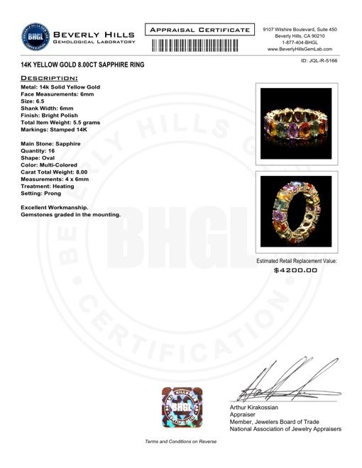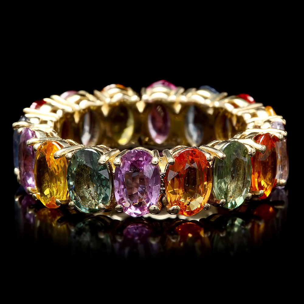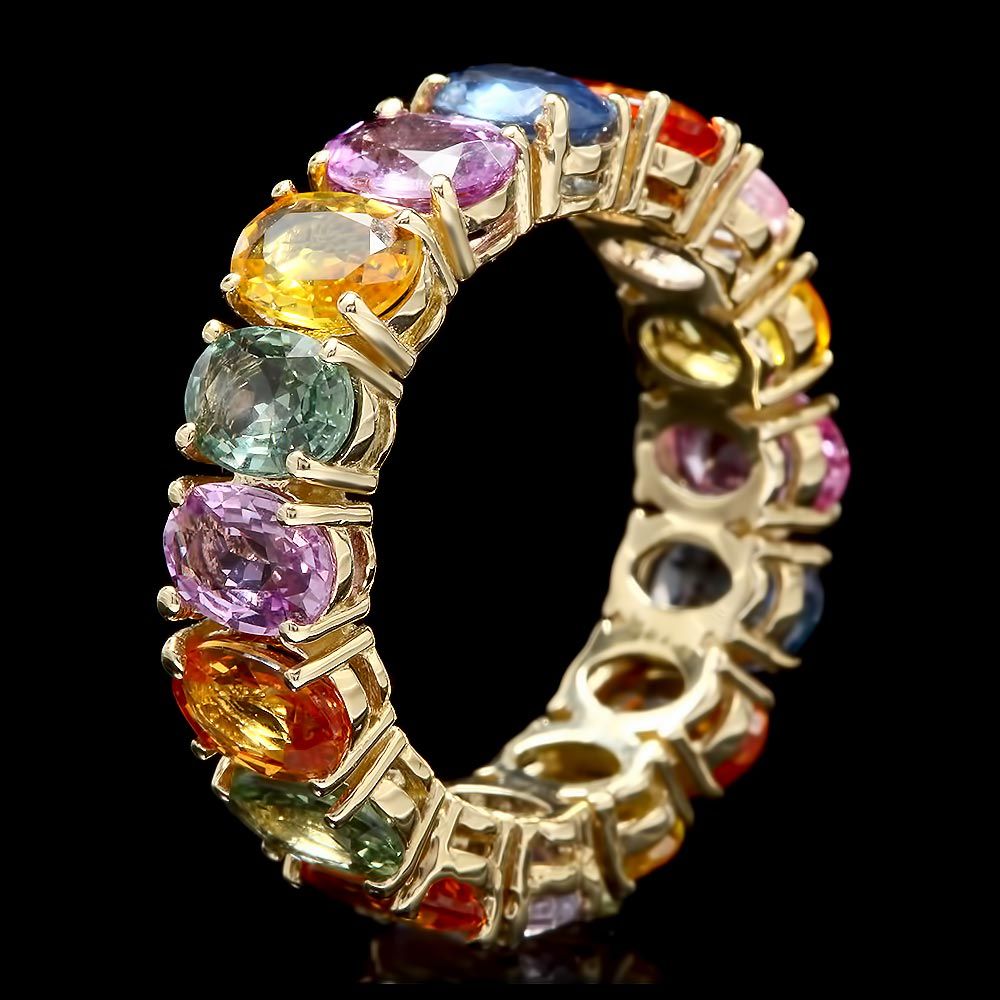 Retail: $4200.00 ****** Metal: 14k Solid Yellow Gold / Size: 6.5 / Total Item Weight: 5.5 grams / Country Made: USA / / Main Stone: Sapphire / Color: Multi-Colored / Carat Total Weight: 8.00 / Treatment: Heating / ****** Ref: JQL-R-5166