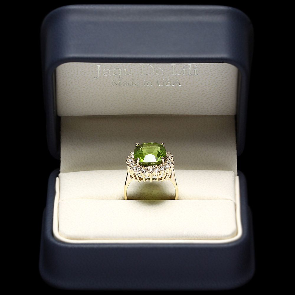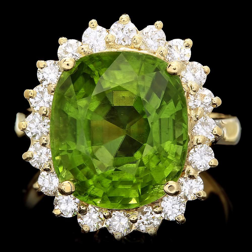 Retail: $10700.00 ****** Metal: 14k Solid Yellow Gold / Size: 7 / Total Item Weight: 7.0 grams / Country Made: USA / / Main Stone: Peridot / Color: Green / Carat Total Weight: 9.00 / Treatment: None / Clarity: Type 2 / Cut: Very Good / / Secondary Stone: Diamond / Carat Total Weight: 1.00 / Treatment: None / Color Grade: H - I / Clarity: SI1 - SI2 / Cut: Very Good / ****** Ref: JQL-R-7759