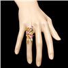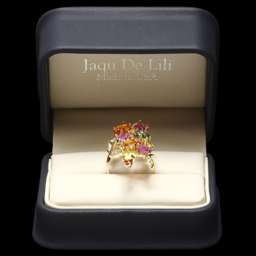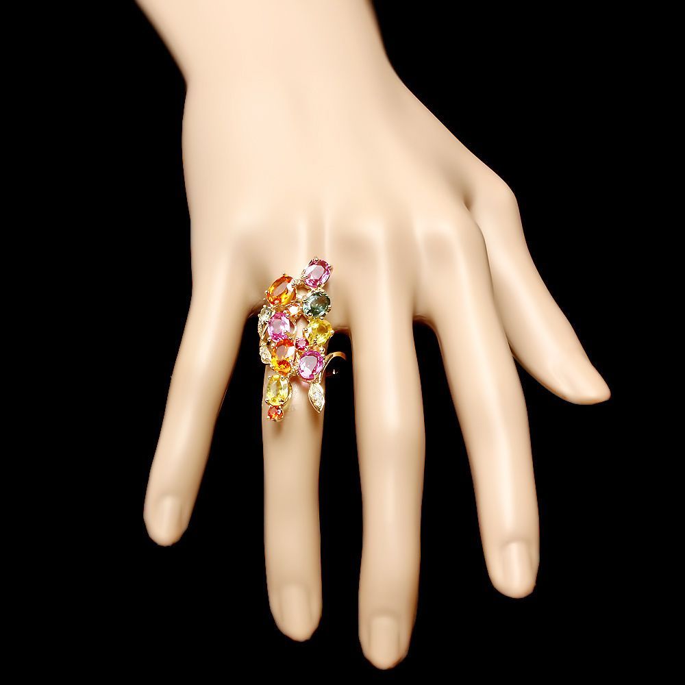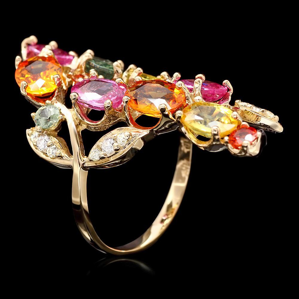 This elegant ladies ring is crafted in solid 14k Yellow Gold and features 8 (8.00 ctw) Natural Sapphires mined from Ceylon, Sri Lanka + accented with 9 sparkling eye-clean natural Diamonds, totaling 0.20 carats and 4 natural Sapphires, totaling 1.50 carats. Excellent craftsmanship. Made in USA.