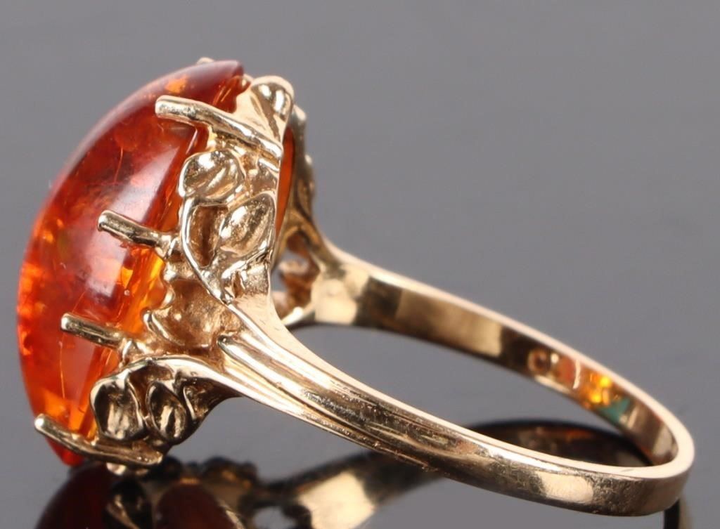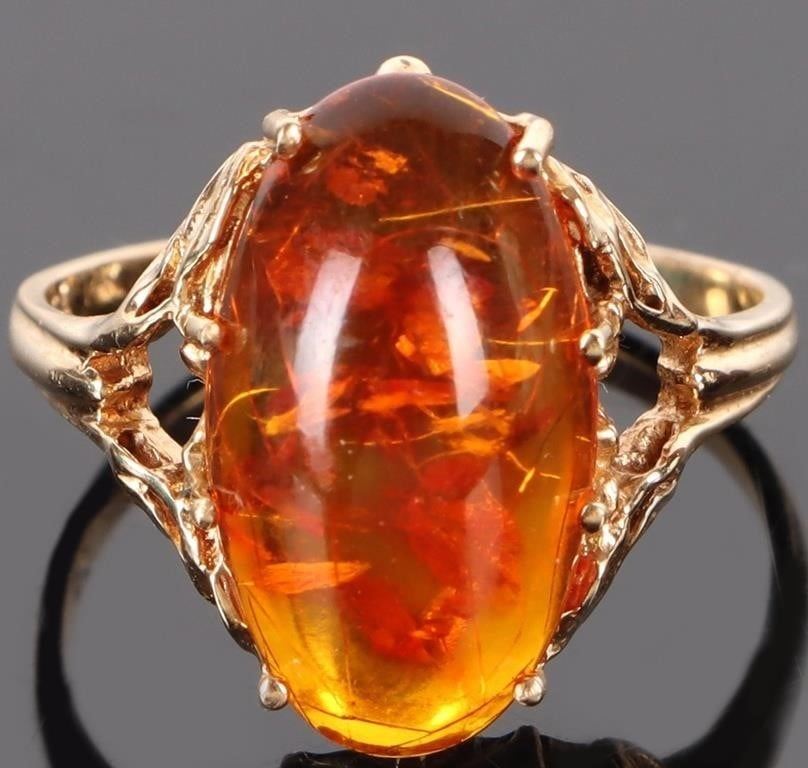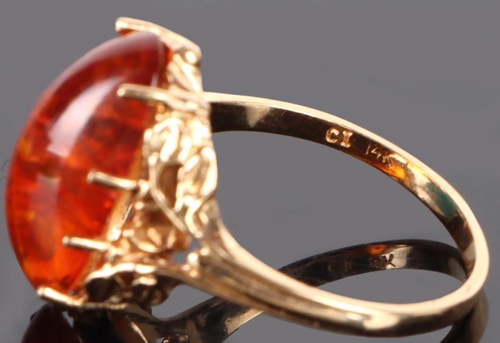 14K yellow gold amber ladies ring. Gemstones to include one 15.31mm X 9.52 mm cabochon amber.