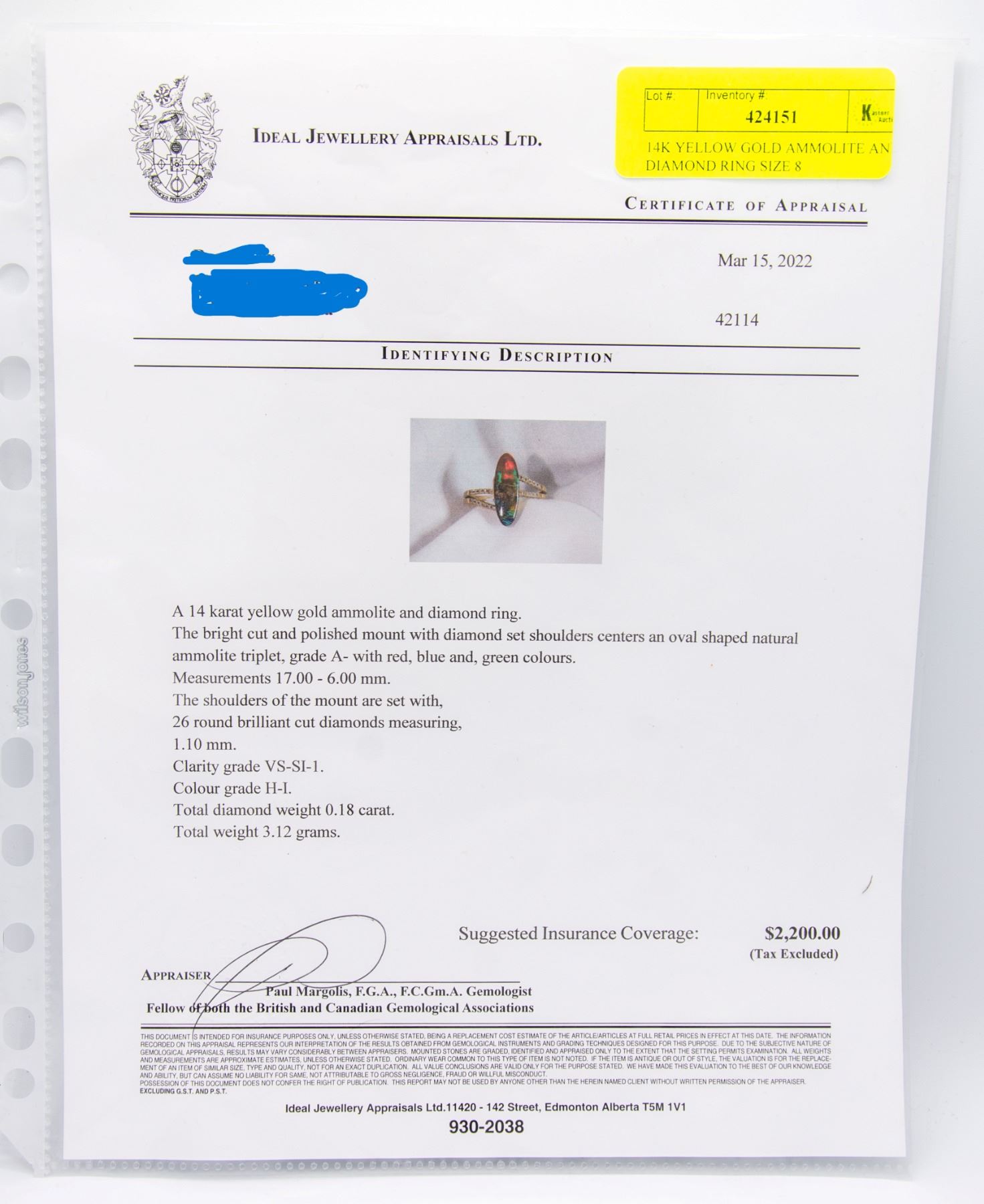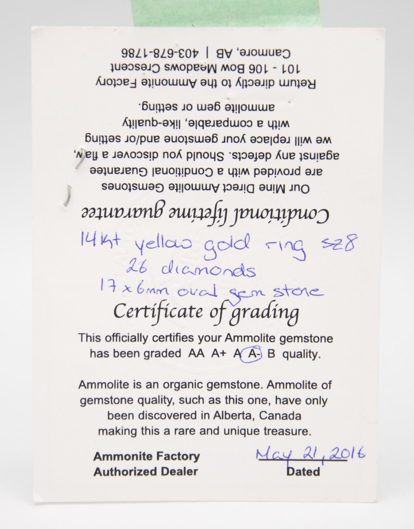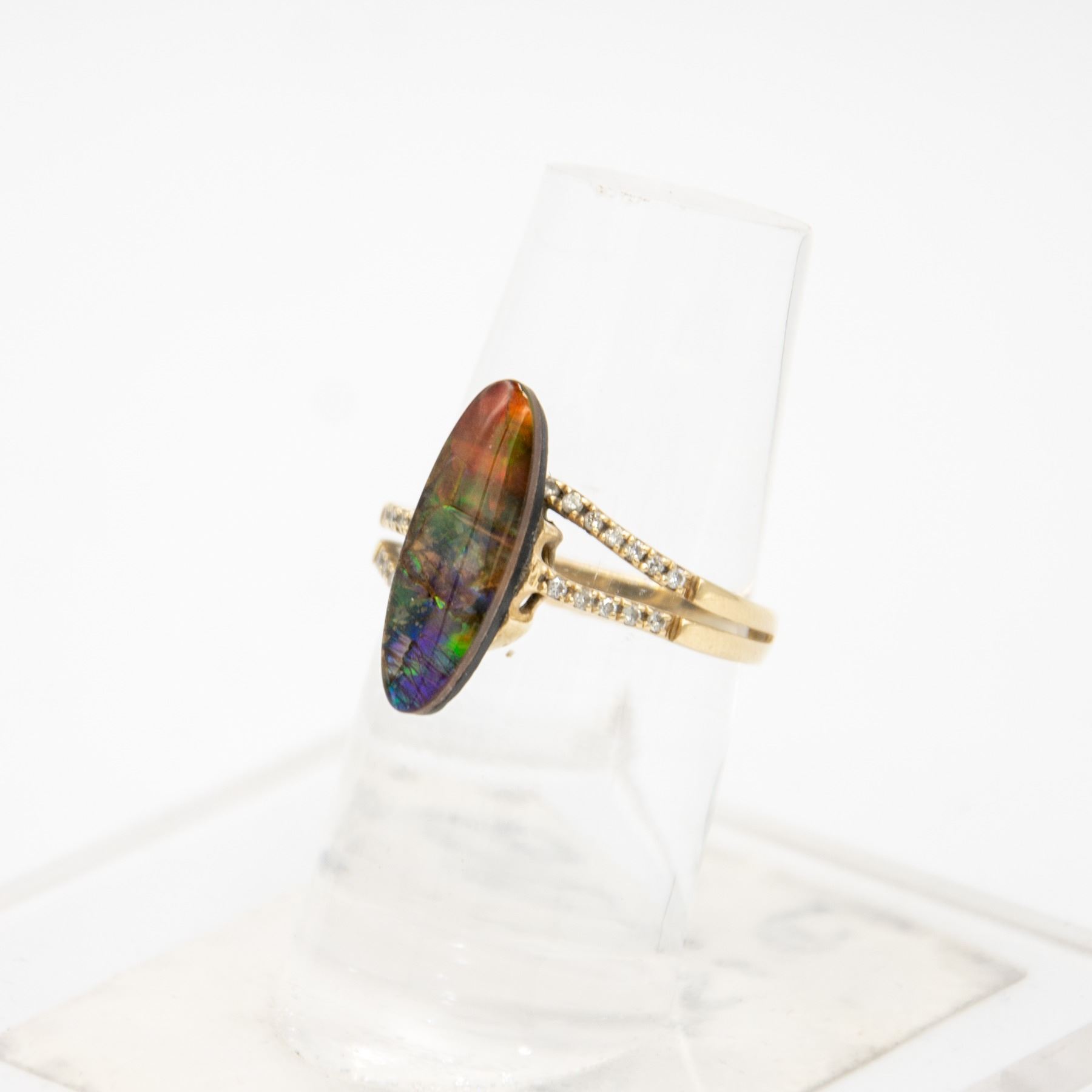 THE BRIGHT CUT AND POLISHED MOUNT WITH DIAMOND SET SHOULDERS CENTRES AN OVAL SHAPED NATURAL AMMOLITE TRIPLET,GRADE A-WITH RED,BLUE AND GREEN COLOURS. MEASUREMENTS 17.00-6.00MM. THE SHOULDERS OF THE MOUNT ARE SET WITH 26 ROUND BRILLIANT CUT DIAMOMNDS MEASURING 1.10MM CLARITY GRADE VS-SI-1 COLOUR GRADE H-I TOTAL DIAMOND WEIGHT .18 CARAT. TOTAL WEIGHT 3.12 GRAMS.