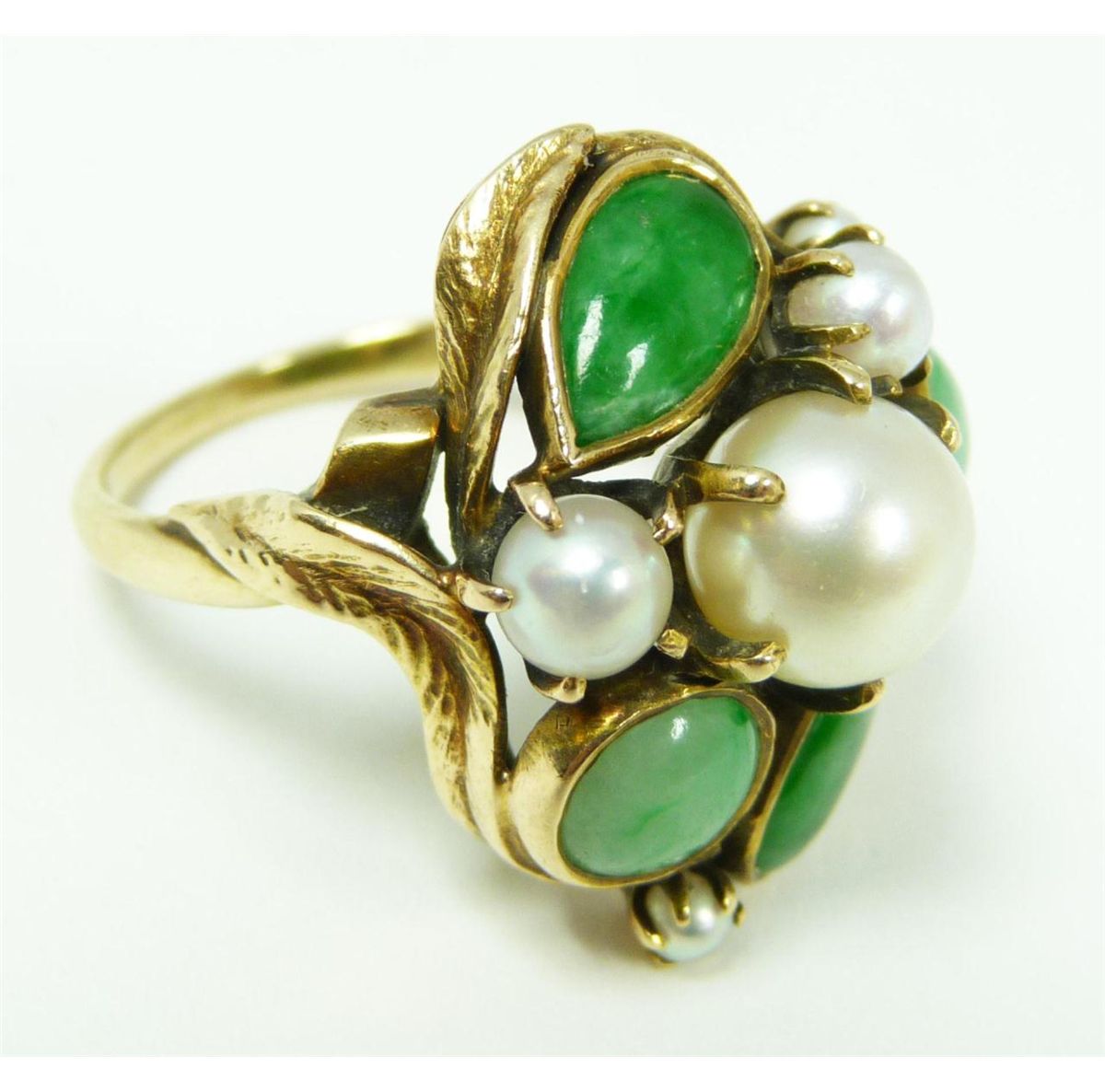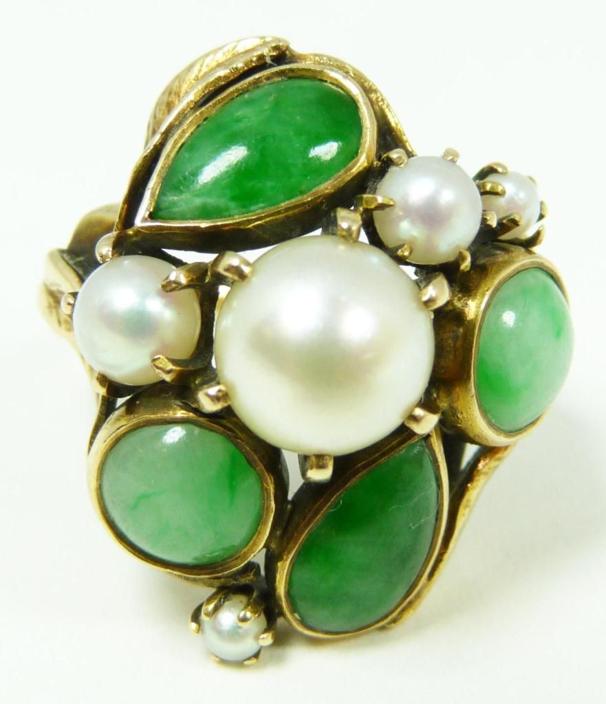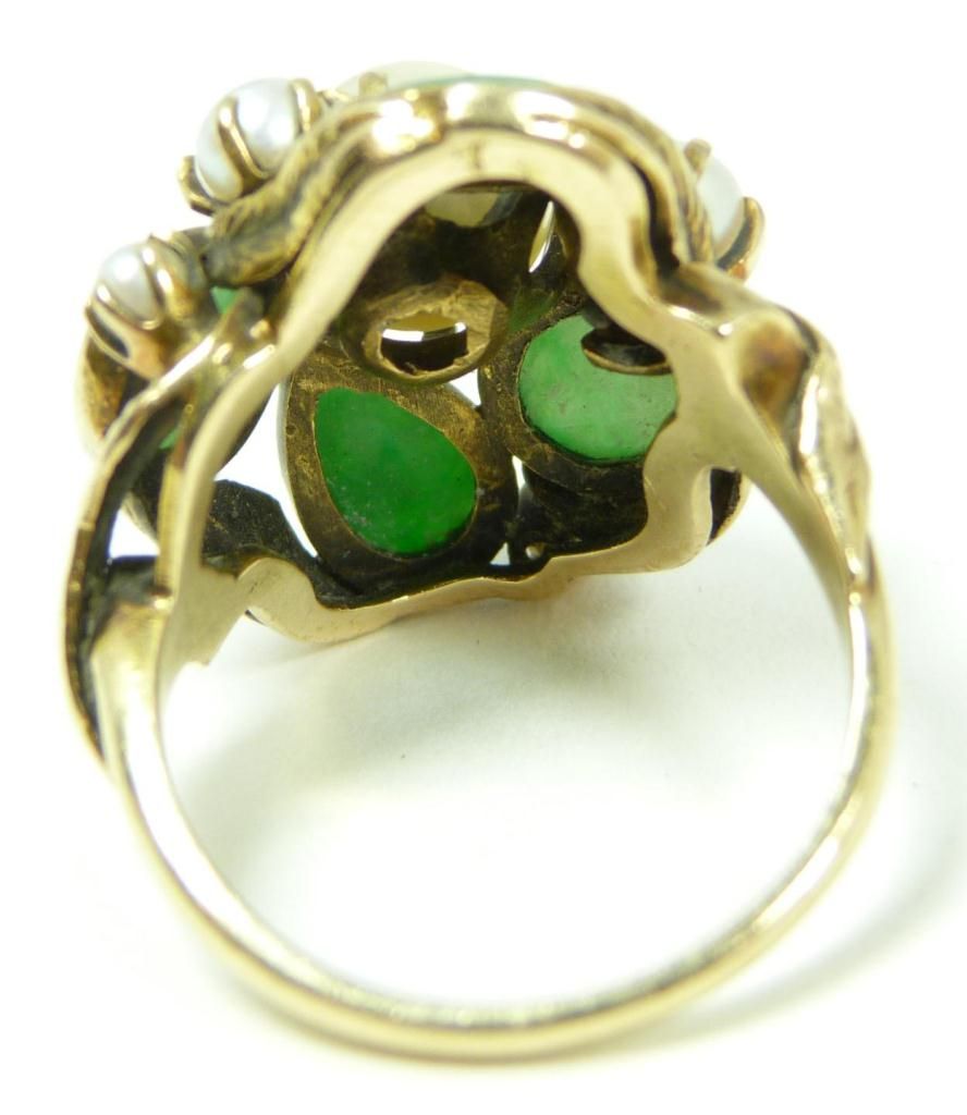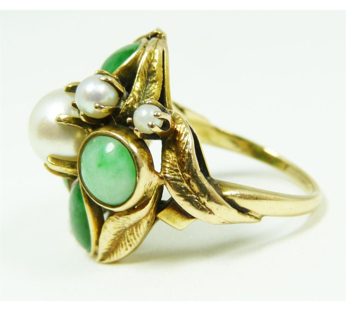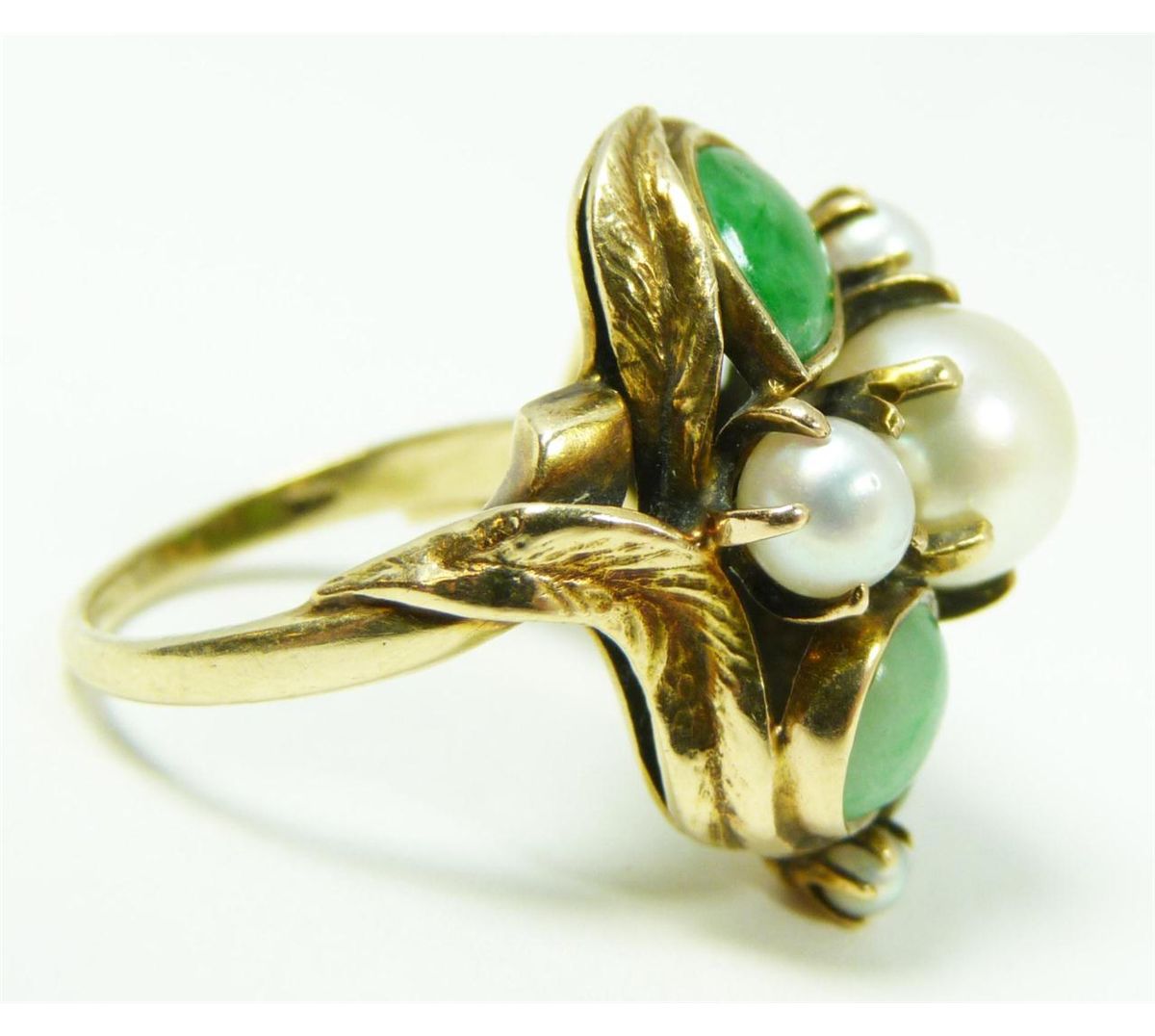 Magnificent beautiful ladies 14k yellow gold figural leaf form ring mount holding two tear drop shaped mottled emerald green jadeite stones measuring approx. 9.1mm x 5.5mm x 1.9mm. Also holds two translucent mottled apple green jadeite round stones measuring approx. 6.4mm x 2.6mm. Natural untreated jade specimens. Holds 6 prong set graduating pearls approx. 3.0mm to 7.7mm. Ring size 7.