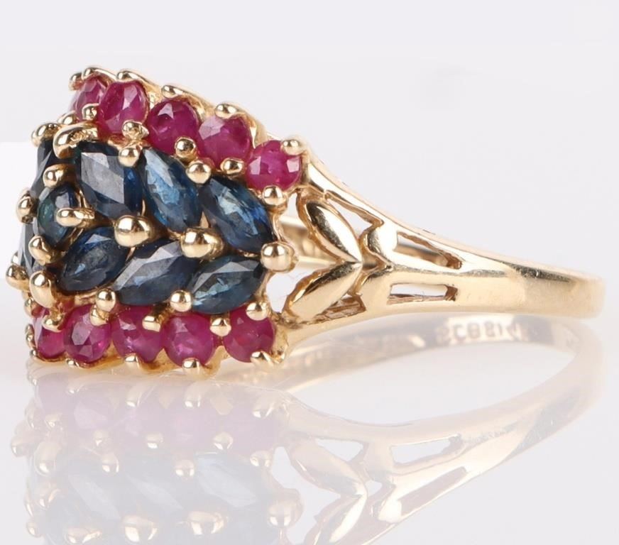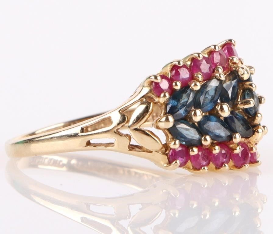 14k yellow gold red and blue topaz ladies ring with thirteen 0.03ct blue topaz and sixteen 0.02ct round red topaz.