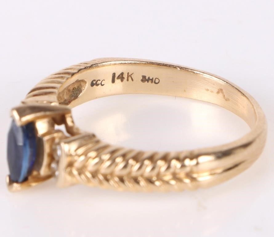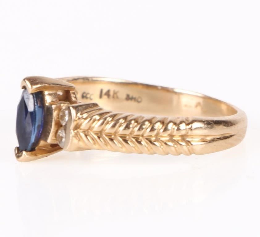 14k yellow gold ladies ring .25ct marquis cut blue sapphire flanked by two .02ct diamonds on each side.