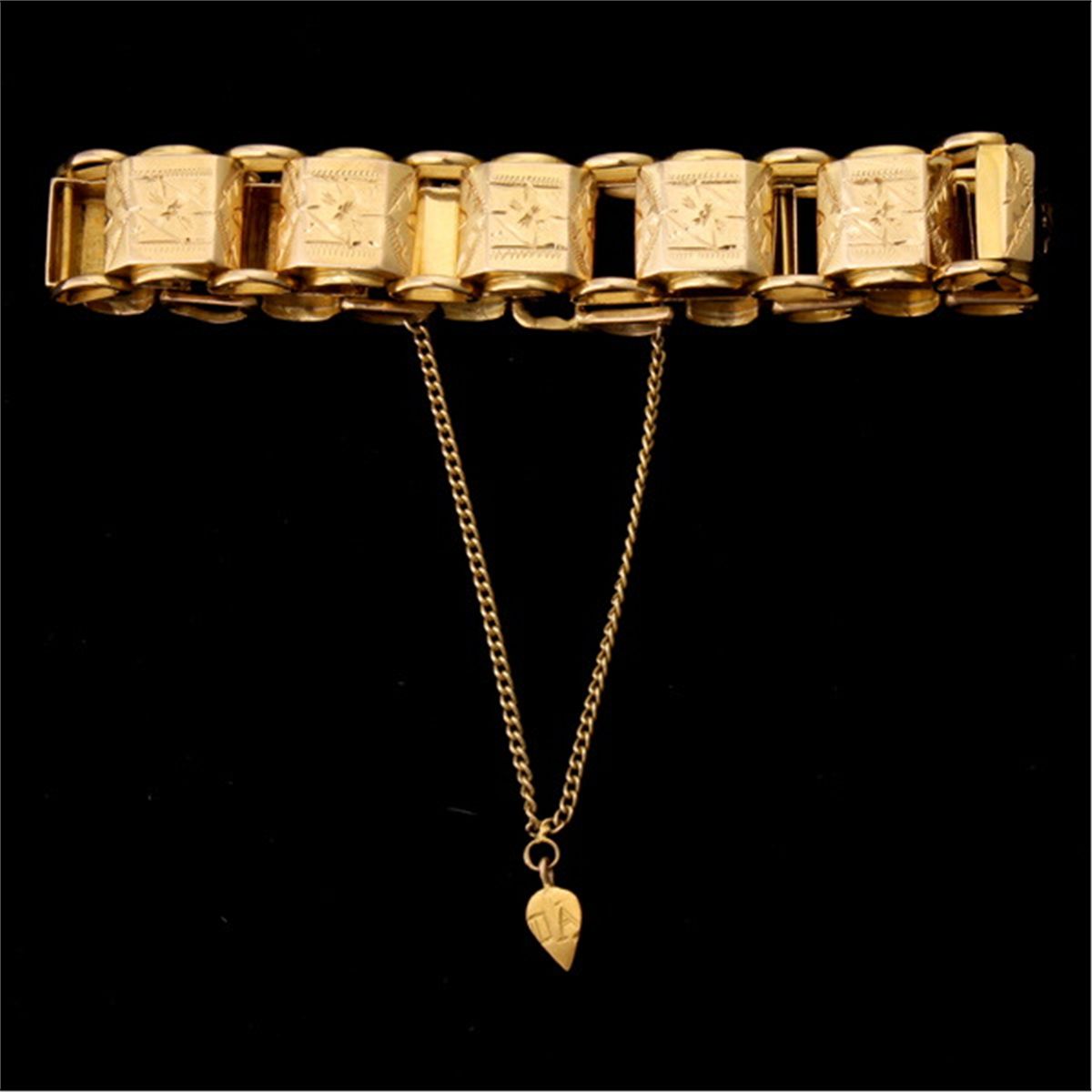 14K YELLOW GOLD BRACELET. Composed of ten loaf shape engraved links completed by a matching clasp. 16.9 dwts