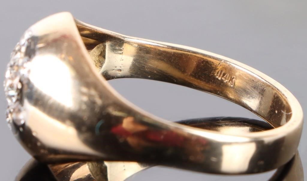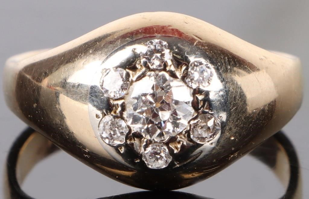 14K yellow gold cluster diamond ladies ring. Gemstones to include one 0.33ct round cut diamond, and six 0.02ct round cut diamonds in a cluster formation.