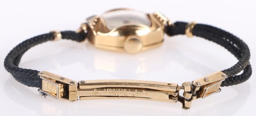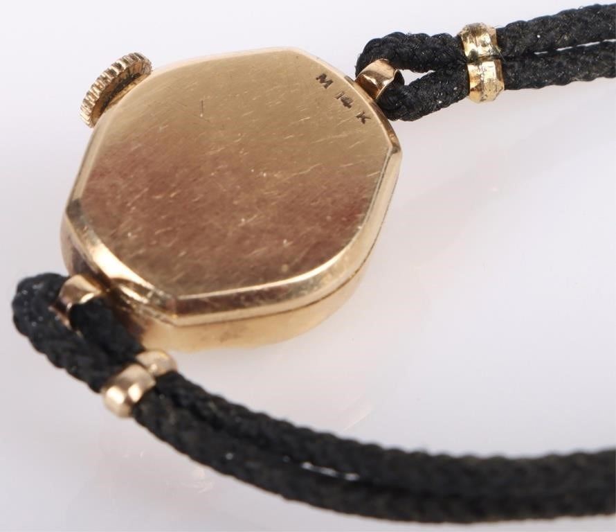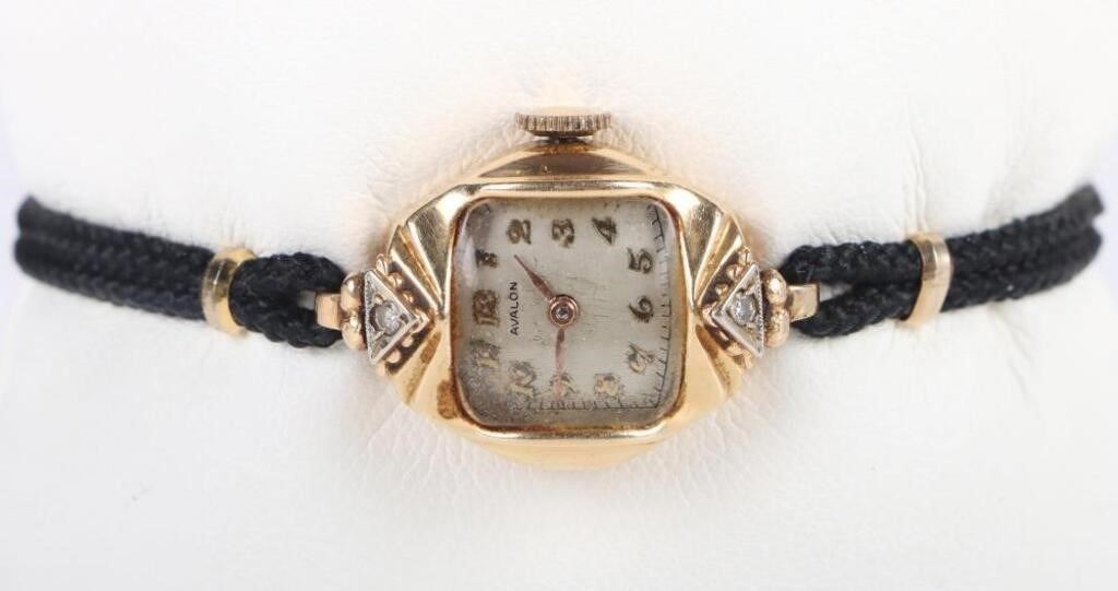 14K yellow gold diamond antique Avalon ladies watch with two 0.01CT round diamonds.