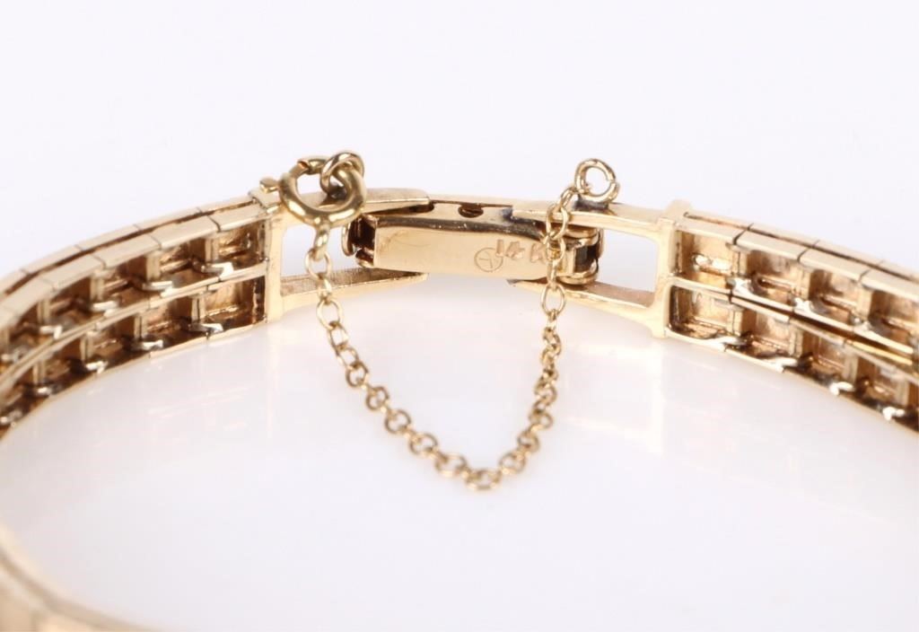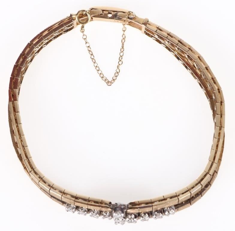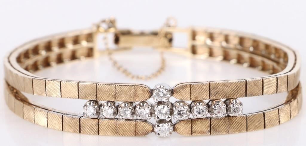 14K yellow gold diamond composite ladies bracelet to include eleven full cut round 0.03 to 0.04ct SI-1 to I-1 color grade G to I diamonds. Each diamond is encased in white gold prongs with an open engraved design.