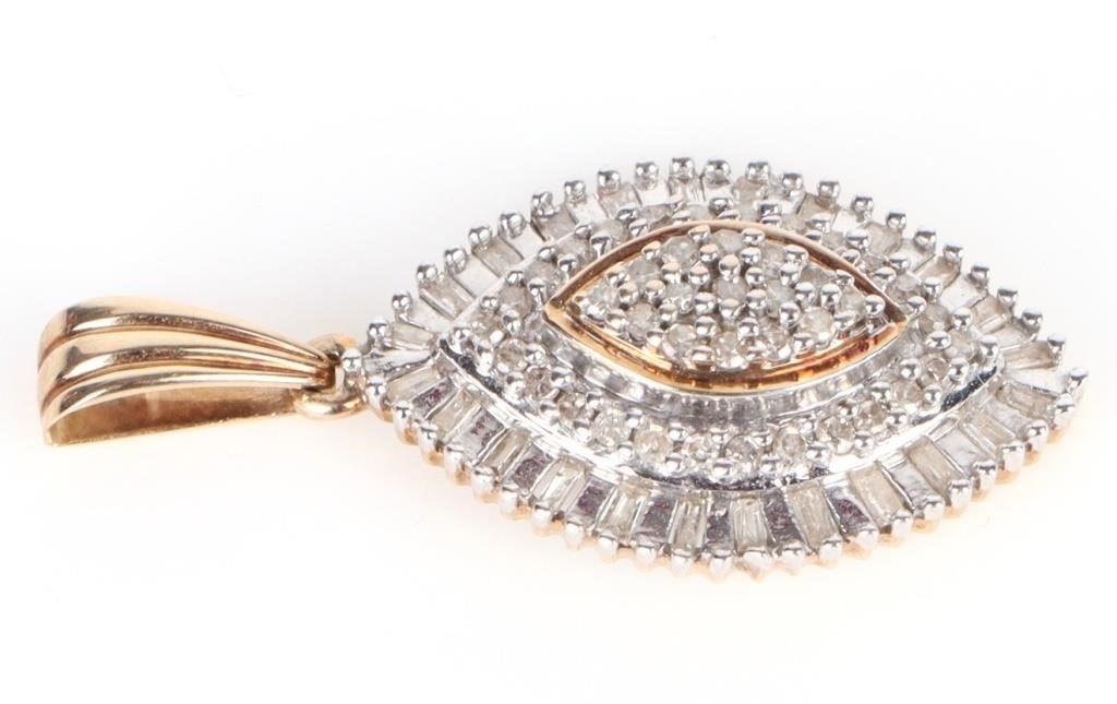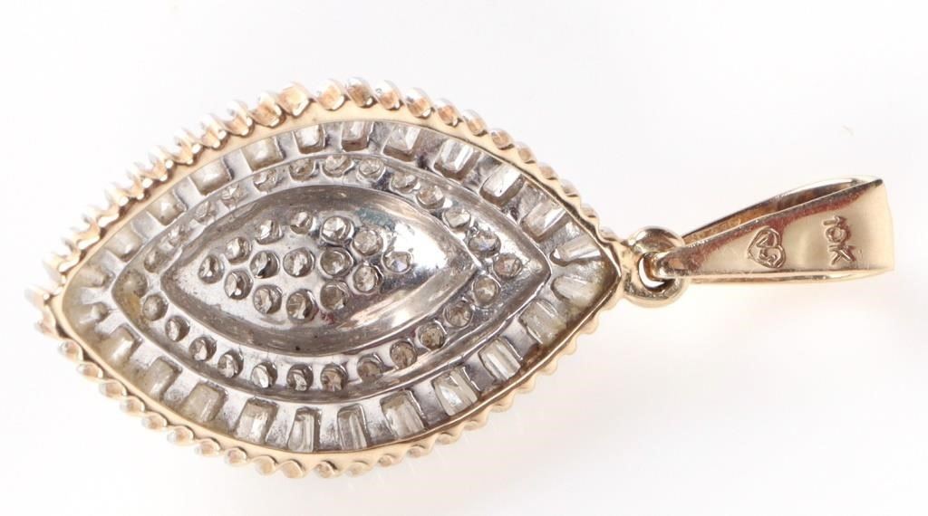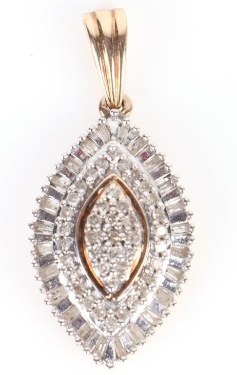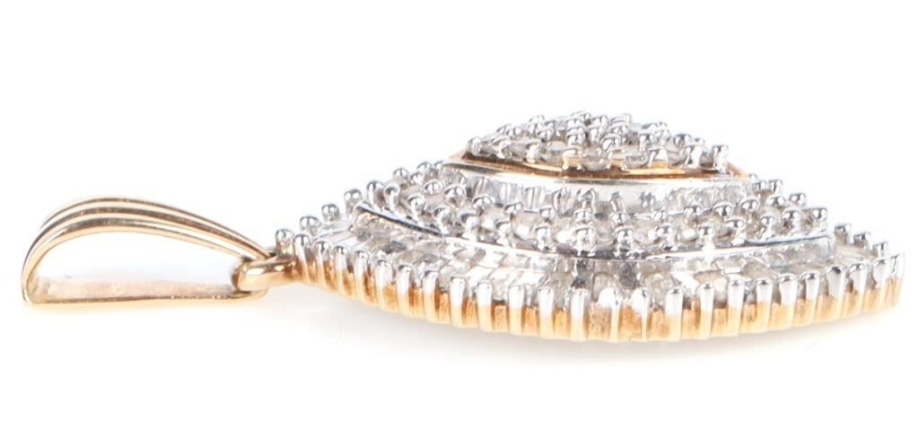 14k yellow gold diamond ladies pendant with forty-six 0.01ct channel diamonds and thirty-eight 0.01ct round diamonds. 0.84 CTW.