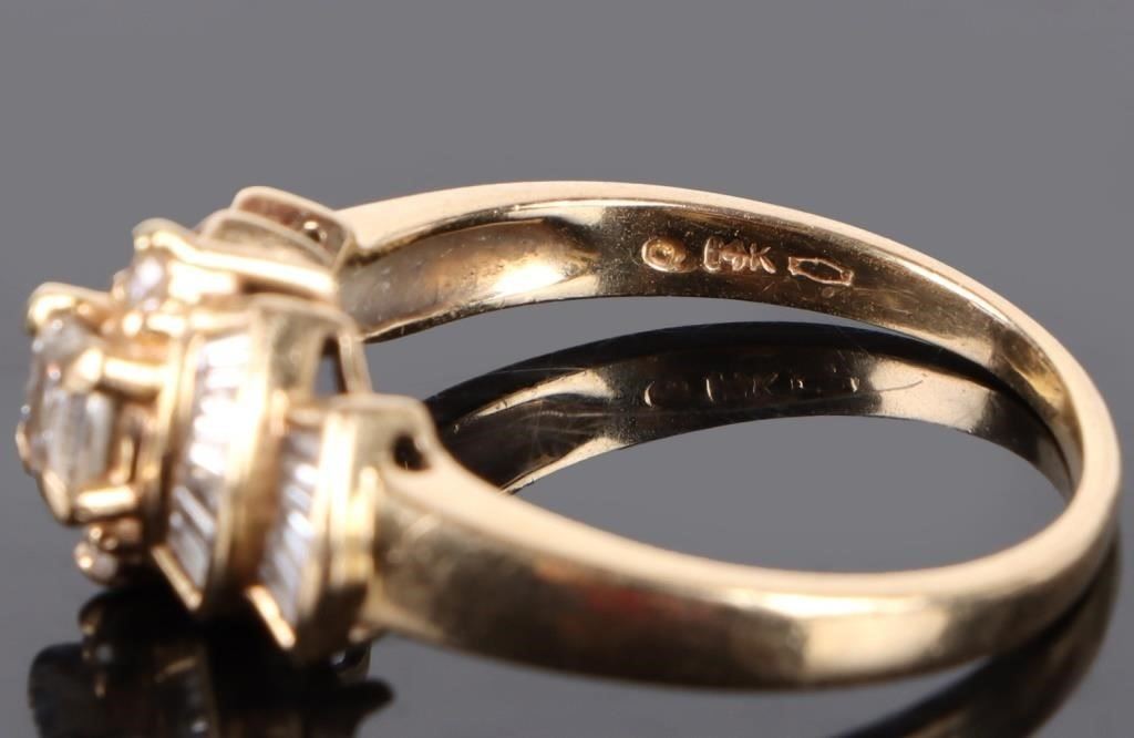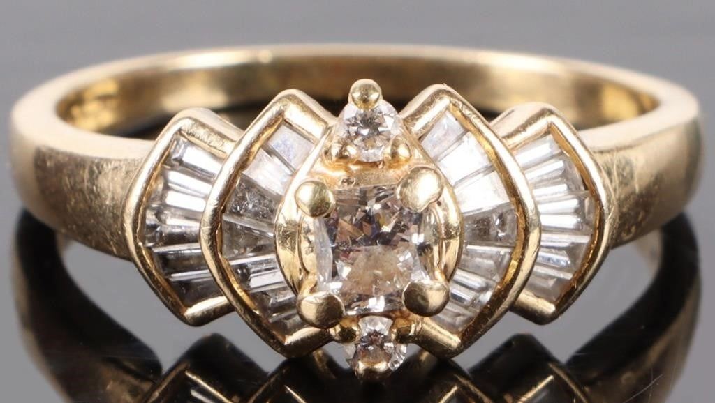 14K yellow gold diamond ladies ring to include one 0.25ct round cut diamond, two 0.02ct round cut diamonds, and twenty-four 0.02ct trapezoidal cut diamonds.