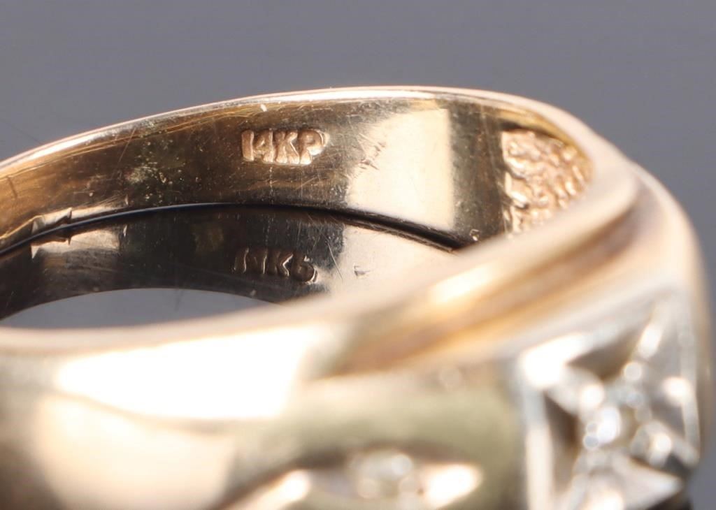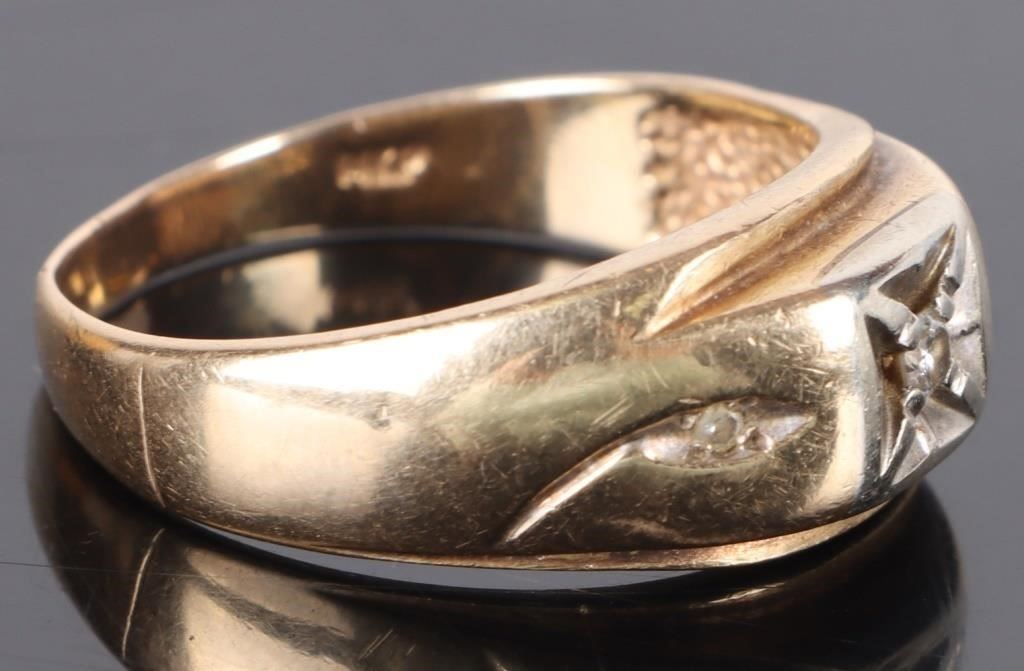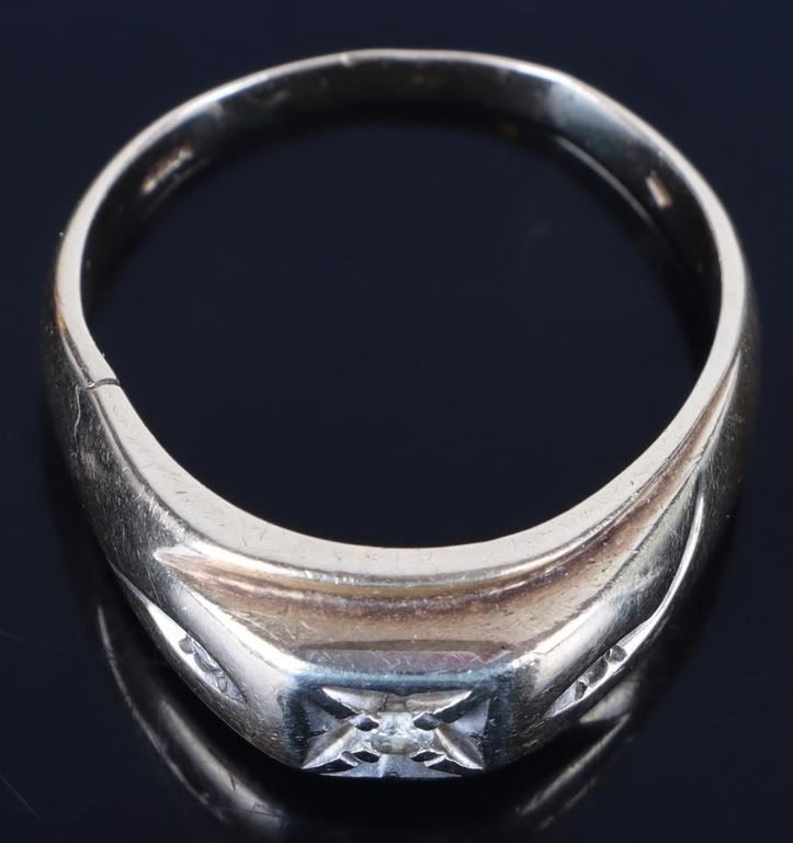 14k yellow gold diamond men's wedding ring with one 0.08ct round diamonds and two 0.02ct round diamonds.
