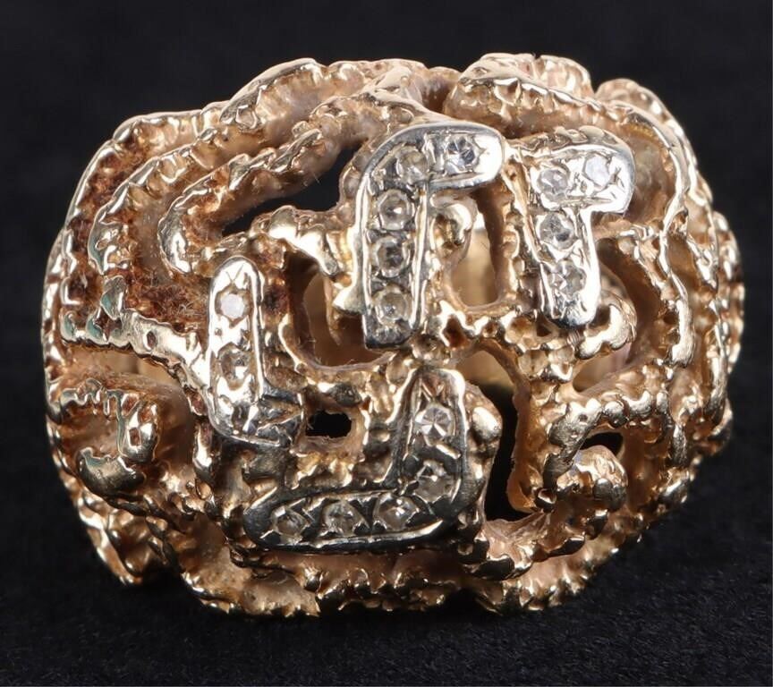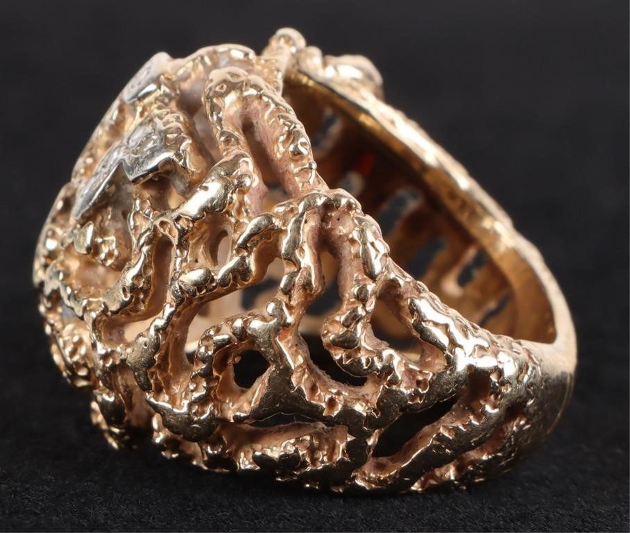 14K yellow gold diamond nugget style men's ring. Gemstones include seventeen 0.02CT round cut diamonds.