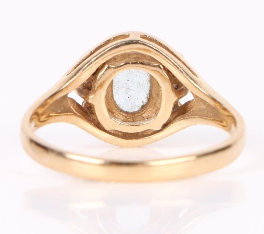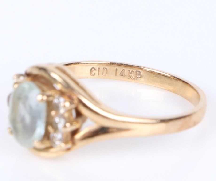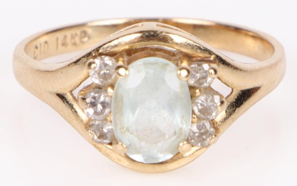 14K yellow gold diamond & amp; tourmaline ladies ring. Gemstones to include six 0.02ct round cut diamonds, and one 0.75ct oval cut light blue tourmaline.