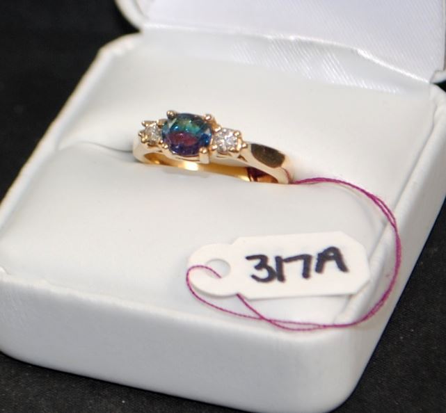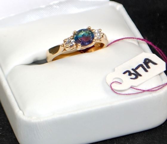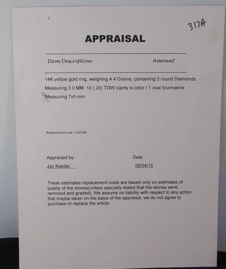 14K YELLOW GOLD RING, CONTAINING 2 ROUND DIAMONDS, .20CTW, SI CLARITY, I 1 COLOR. AND ONE OVAL TOURMALINE MEASURING 7X5MM. THE APPRAISED REPLACEMENT COST IS $1,150.00. AND COMES WITH THE APPRAISAL FOR INSURANCE