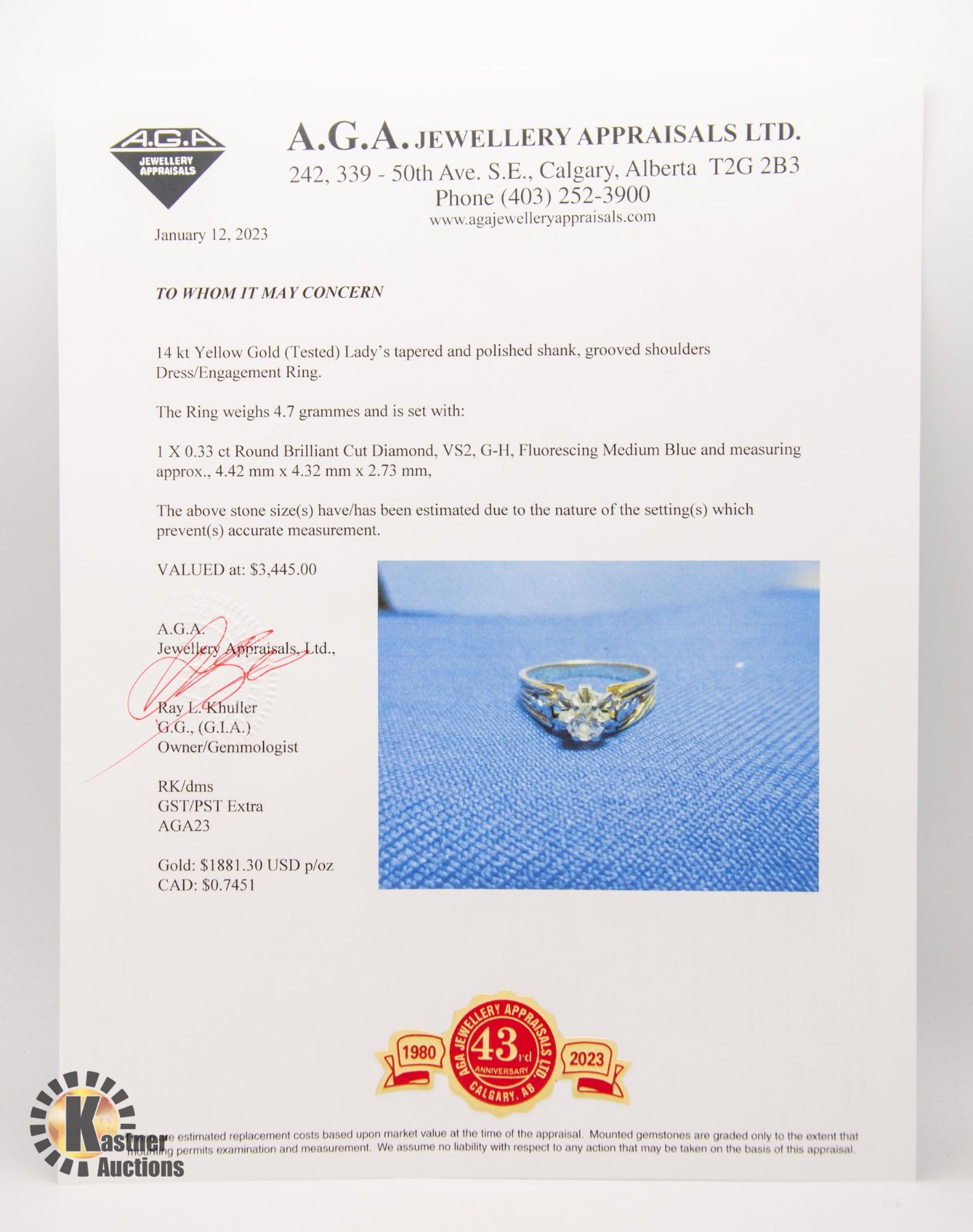 RING HAS A TAPERED AND POLISHED SHANK WITH GROOVED SHOULDERS, ONE 0.33 CT ROUND BRILLIANT CUT DIAMOND (VS2 G-H, FLUORESCING MEDIUM BLUE HUE AND APPROX 4.42 X 4.32 X 2.73MM) RING WEIGHT IS 4.7G. COMES WITH APPRAISAL FROM AGA $3,445.00 **ALL ITEMS MUST BE REMOVED BY 5PM SATURDAY, SEPTHEMBER 16TH 2023. ALL REMAINING ITEMS WILL BE SUBJECT TO A $6.00 PER DAY STORAGE CHARGE. ANY ITEMS REMAINING AFTER MONDAY, OCTOBER 2ND, 2023 WILL BE CONSIDERED FORFEITED. NO REFUNDS WILL BE ISSUED FOR FORFEITED ITEMS. TO SCHEDULE A PICK UP APPOINTMENT CLICK HERE