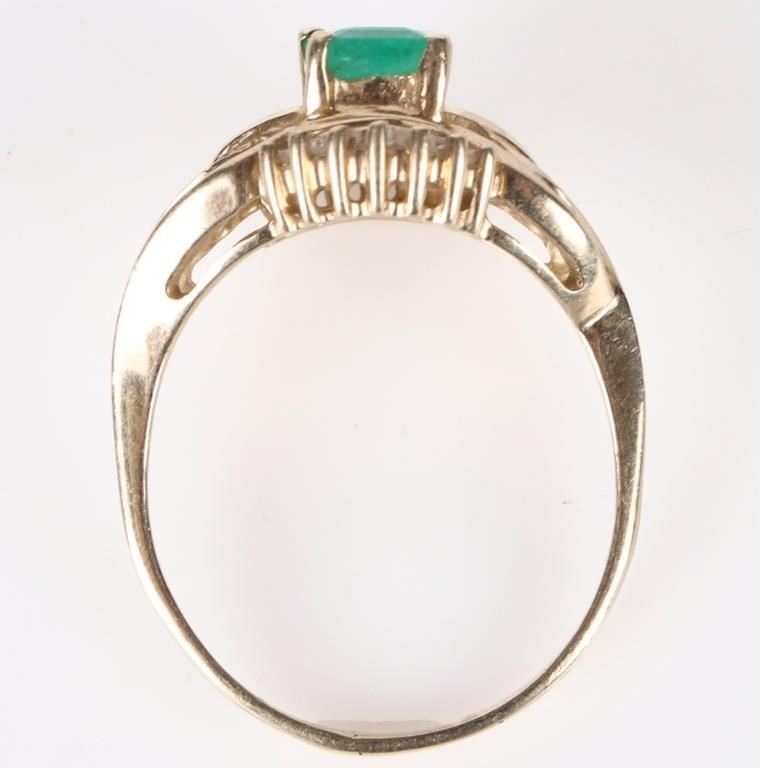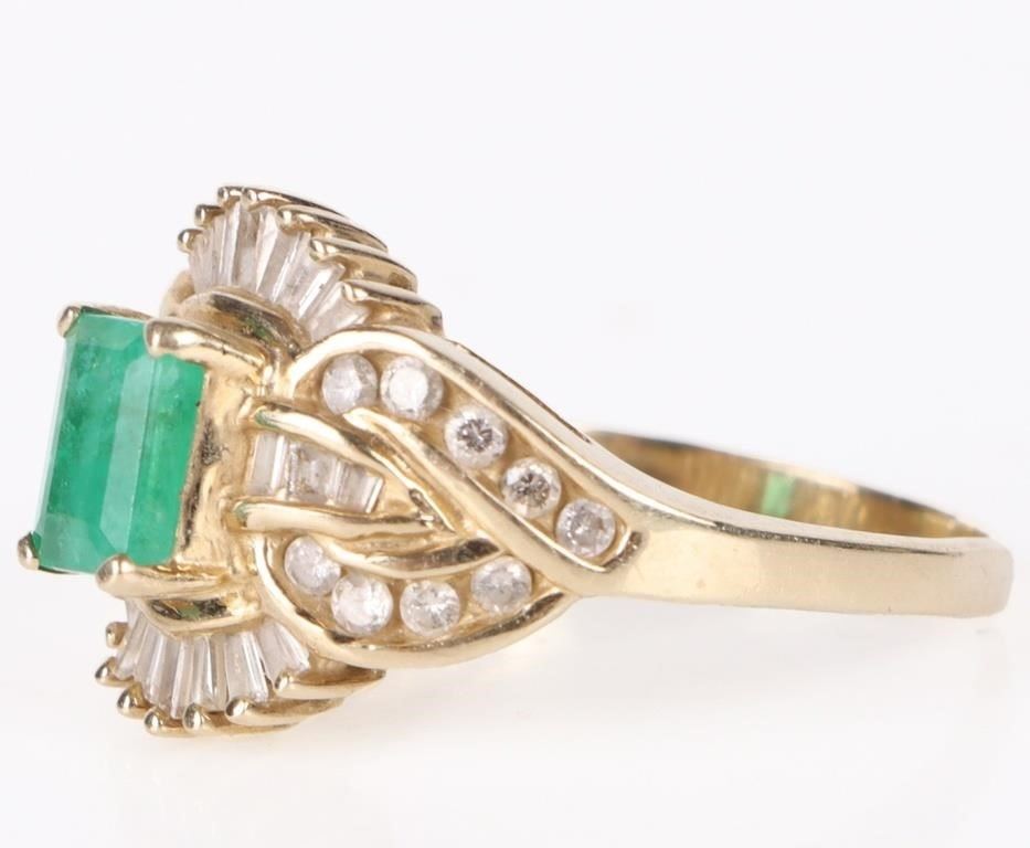 14K yellow gold emerald diamond ladies ring. Gemstones to include one 0.75ct emerald cut emerald, twenty 0.01 to 0.03ct rectangular/ trapezoidal cut diamonds, and eighteen 0.02ct round cut diamonds.