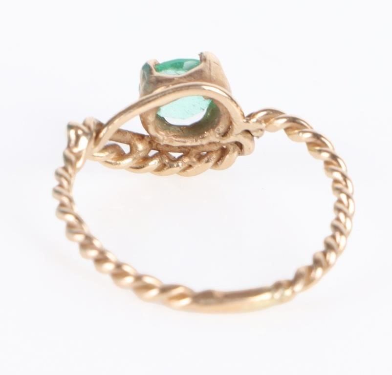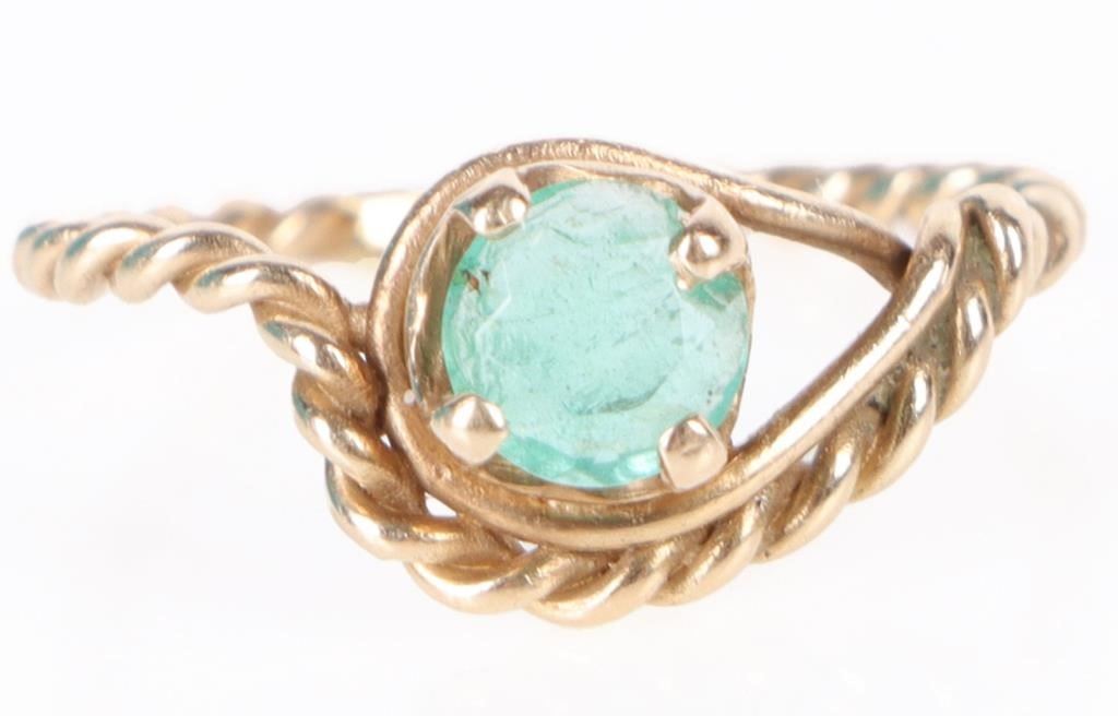 14k yellow gold emerald ladies rope twist ring with one 0.50ct round light green emerald.