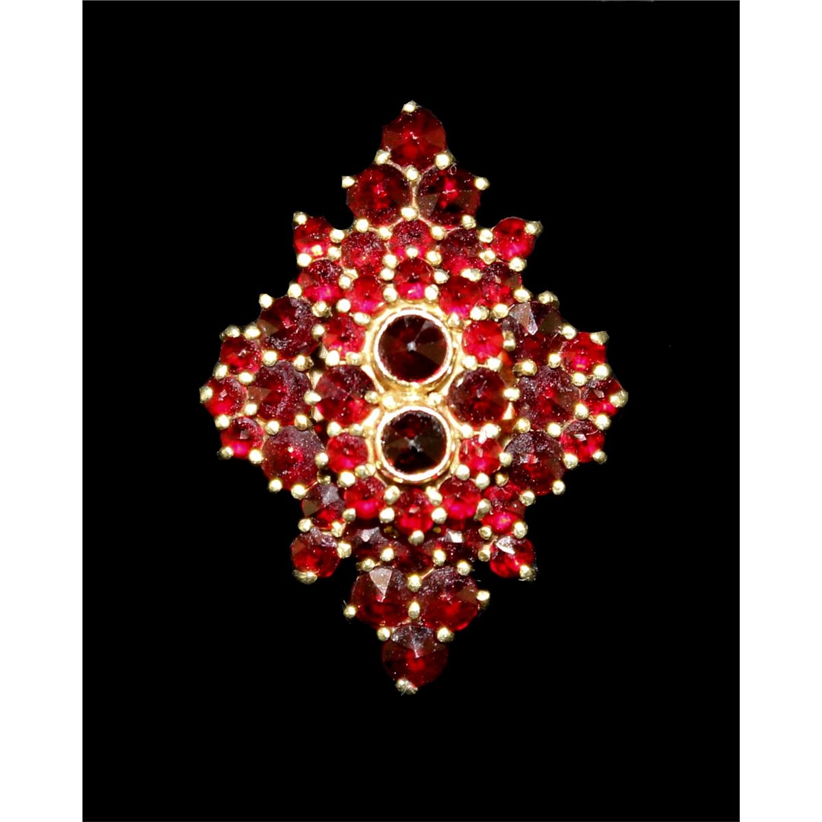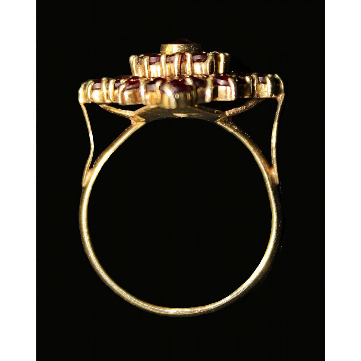 Mid 20th century. The plain band mounted with a diamond shaped table set with round rose cut garnets. Ring size, 8 Total weight, 7.2 grams