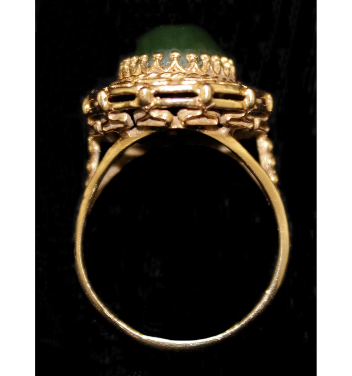 Mid 20th century. The pierced oval table set with an oval spinach green jade cabochon. Ring size, 9.5 Total weight, 7.7 grams