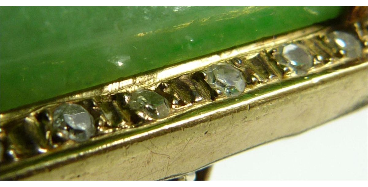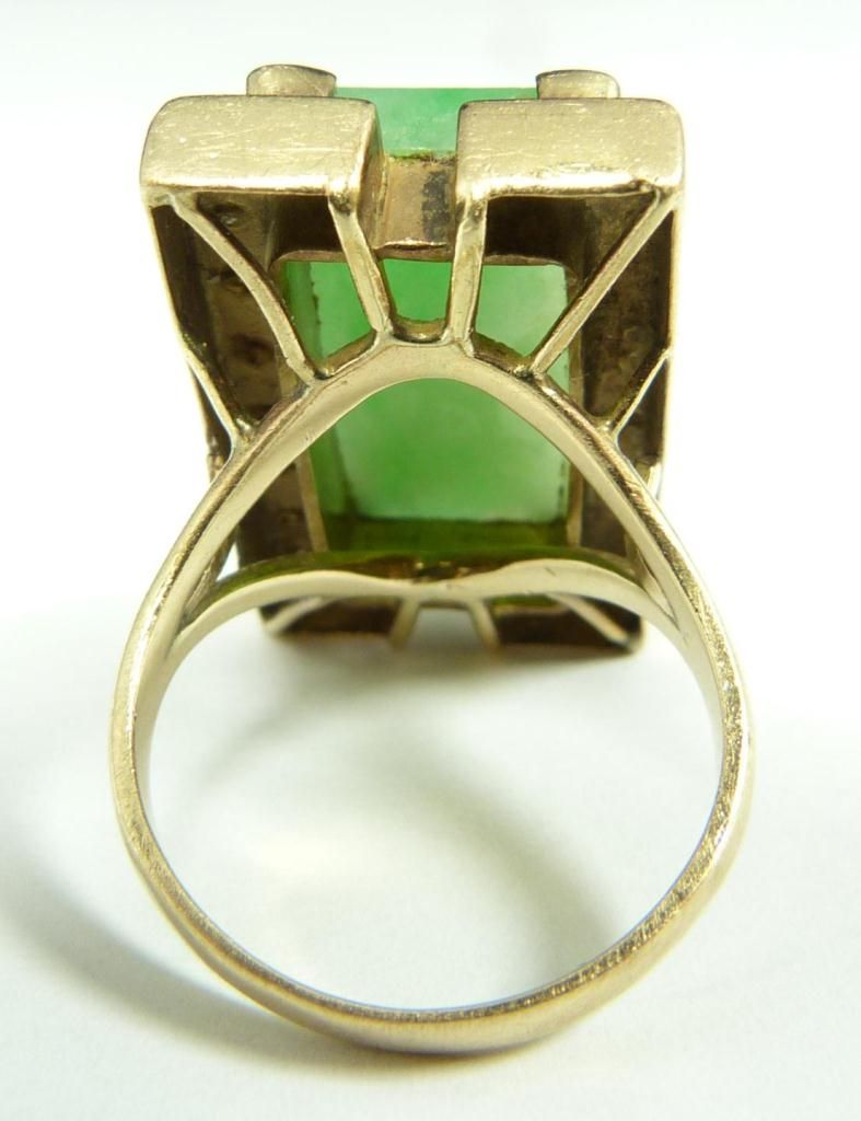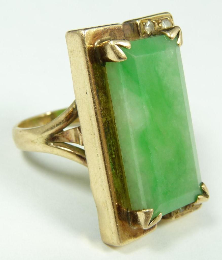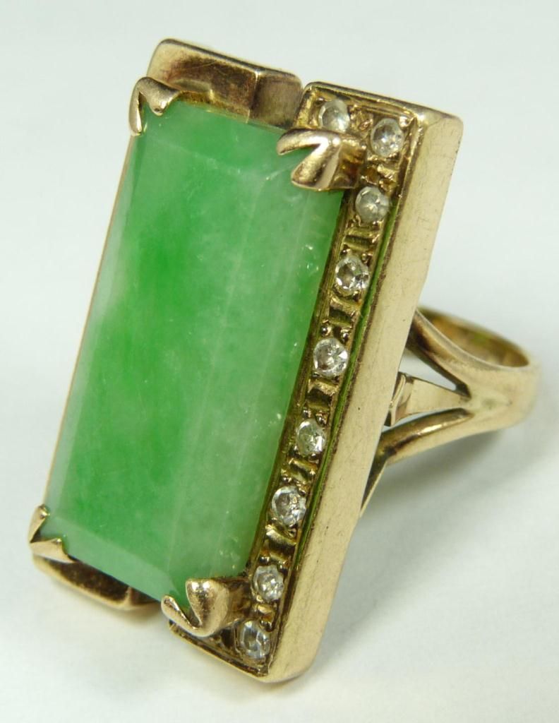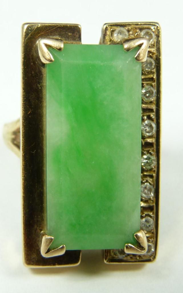 14k yellow gold ring mount holding a rectangular cut jadeite stone having a glowing translucent white and apple green color. Holds 10 round cut diamonds approx. 0.50ctw. Ring size 8.25. Measures approx 1 1/8" length (2.8cm). Total weight of 7.8dwt.