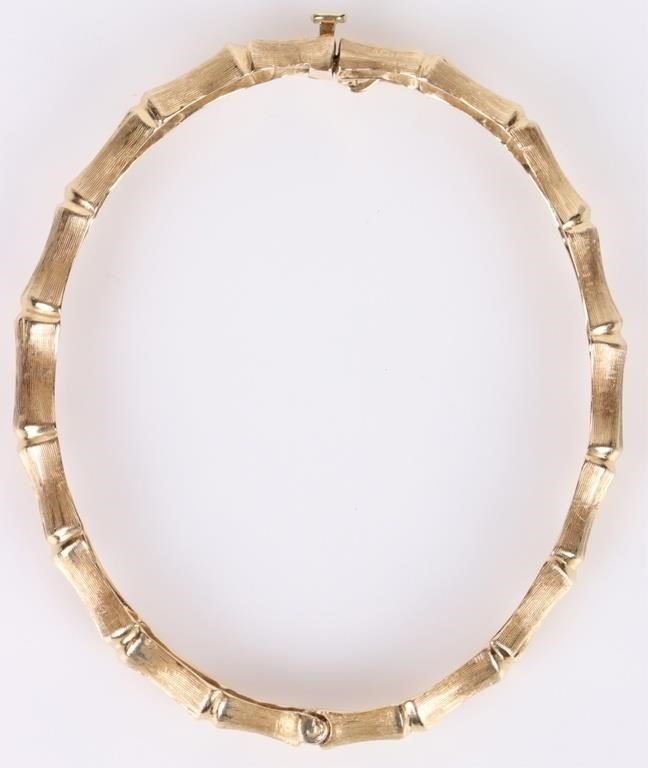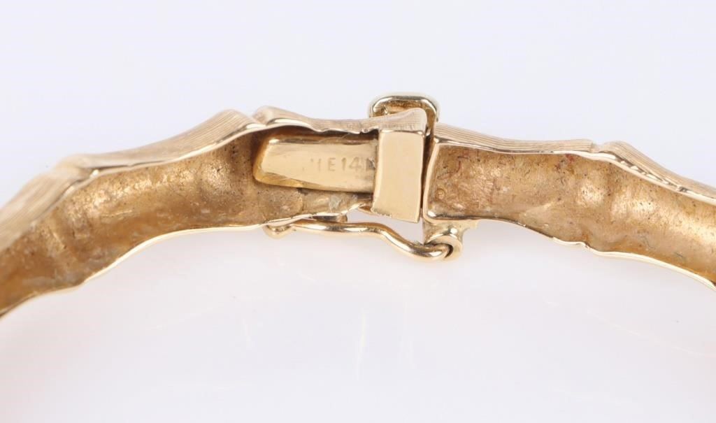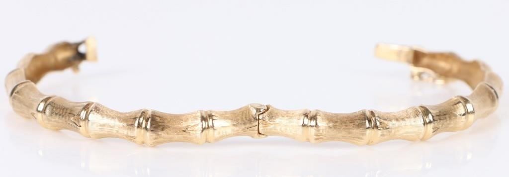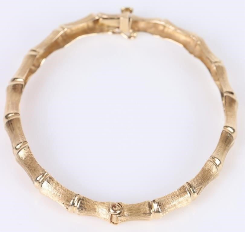 14k gold ladies bangle bracelet featuring a bamboo pattern.